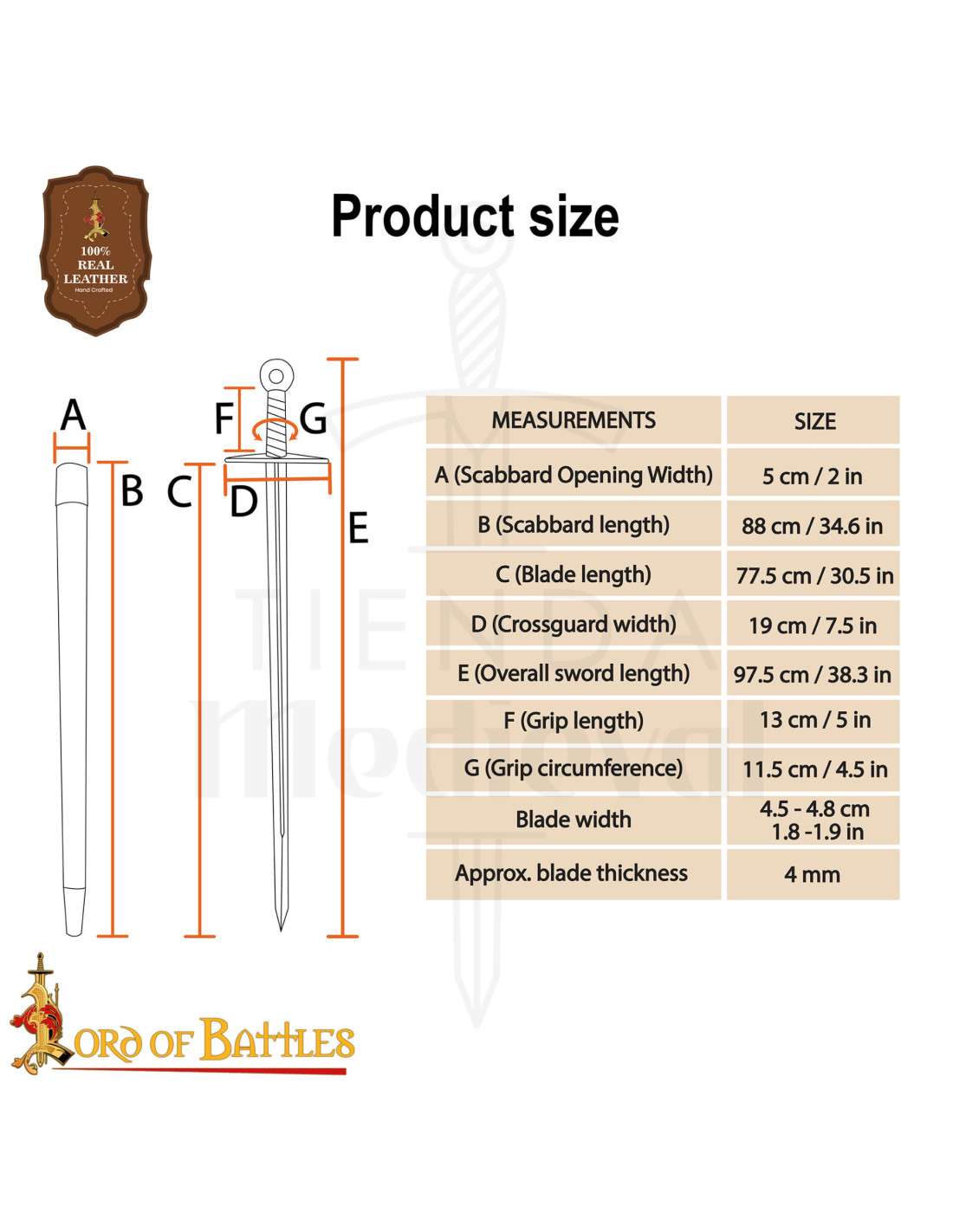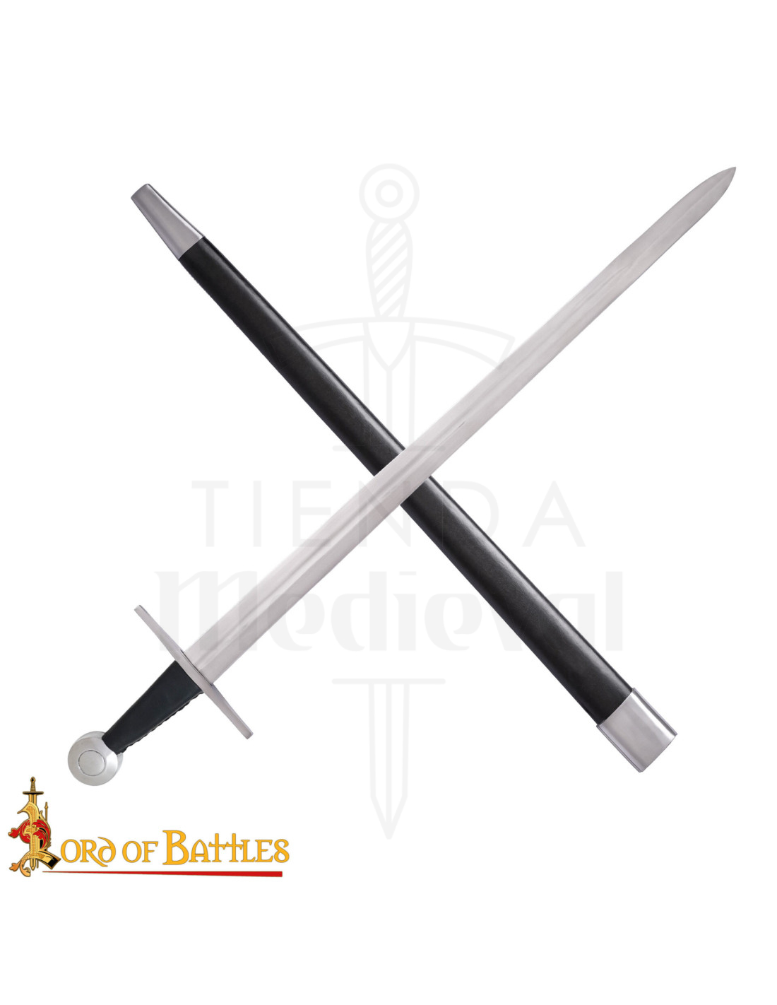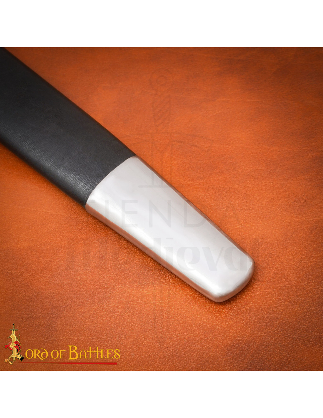 Each sword is born from the skilled work of the blacksmith, featuring a steel blade treated to withstand controlled use without the need for a sharp edge, allowing you to practice with confidence. The straight design and satin metallic finish provide visual presence and ease of maintenance, while the rectangular guard and peened metal pommel add sturdiness and durability to every maneuver. The leather-wrapped grip ensures a comfortable and stable hold, ideal for prolonged sessions without the sword becoming uncomfortable.