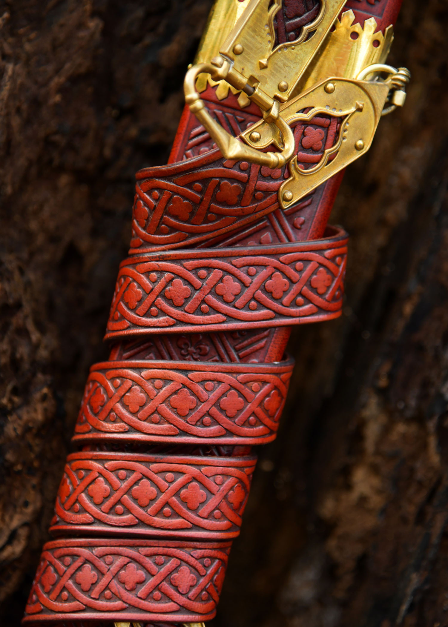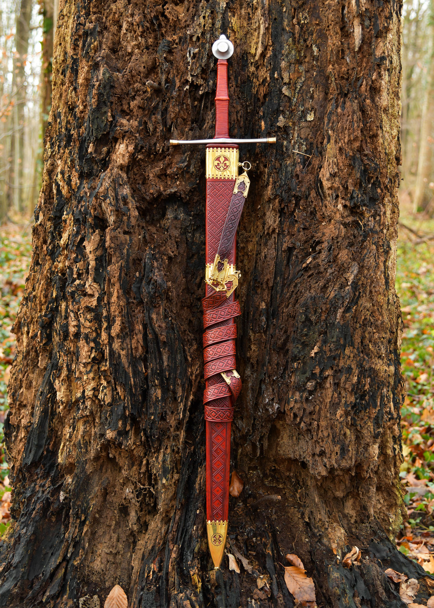 The rigid scabbard in dark red leather, with geometric reliefs and golden trims featuring fleur-de-lis motifs, protects the piece and adds an elegant and secure way to carry it. Its straps and metal ring allow it to be held firmly and displayed in style, while the raised decorations enhance the presentation, designed for those who value historical aesthetics.