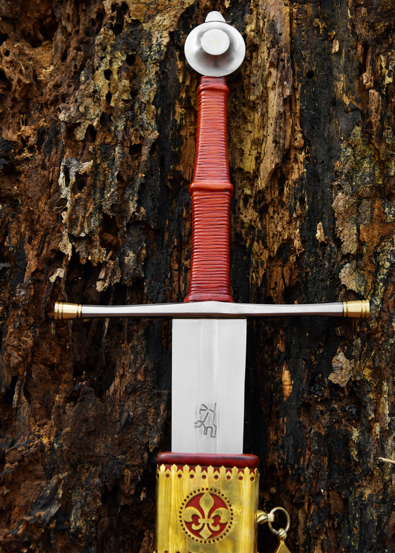 The grip wrapped in reddish-orange tone ensures a comfortable and reliable hold, ideal for displaying the sword naturally or handling it as an accessory in reenactments. The steel crossguard and the pommel decorated with brass crosses visually balance the piece, facilitating its handling and offering a finish that is in line with its late medieval aesthetics. The contrast between the polished blade and the golden trims of the scabbard reinforces its display-worthy appearance.