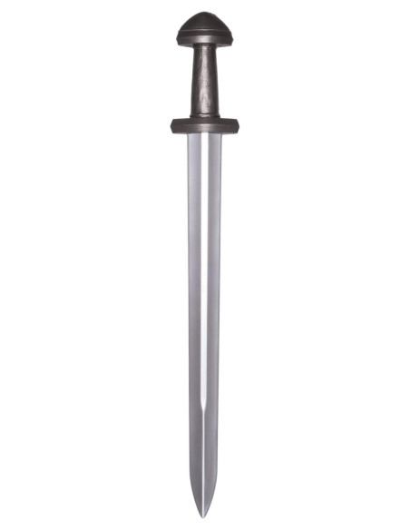 The Viking Short Sword for LARP, Frode Model combines a sober aesthetic with functionality designed for realistic gameplay. The blade features a metallic finish and a central groove that gives it an authentic look, while the symmetrical tip maintains classic lines without compromising safety in combat. The matte black finished grip, the straight guard, and the rounded pommel not only enhance visual presence but also ensure a firm and comfortable grip during long battles.