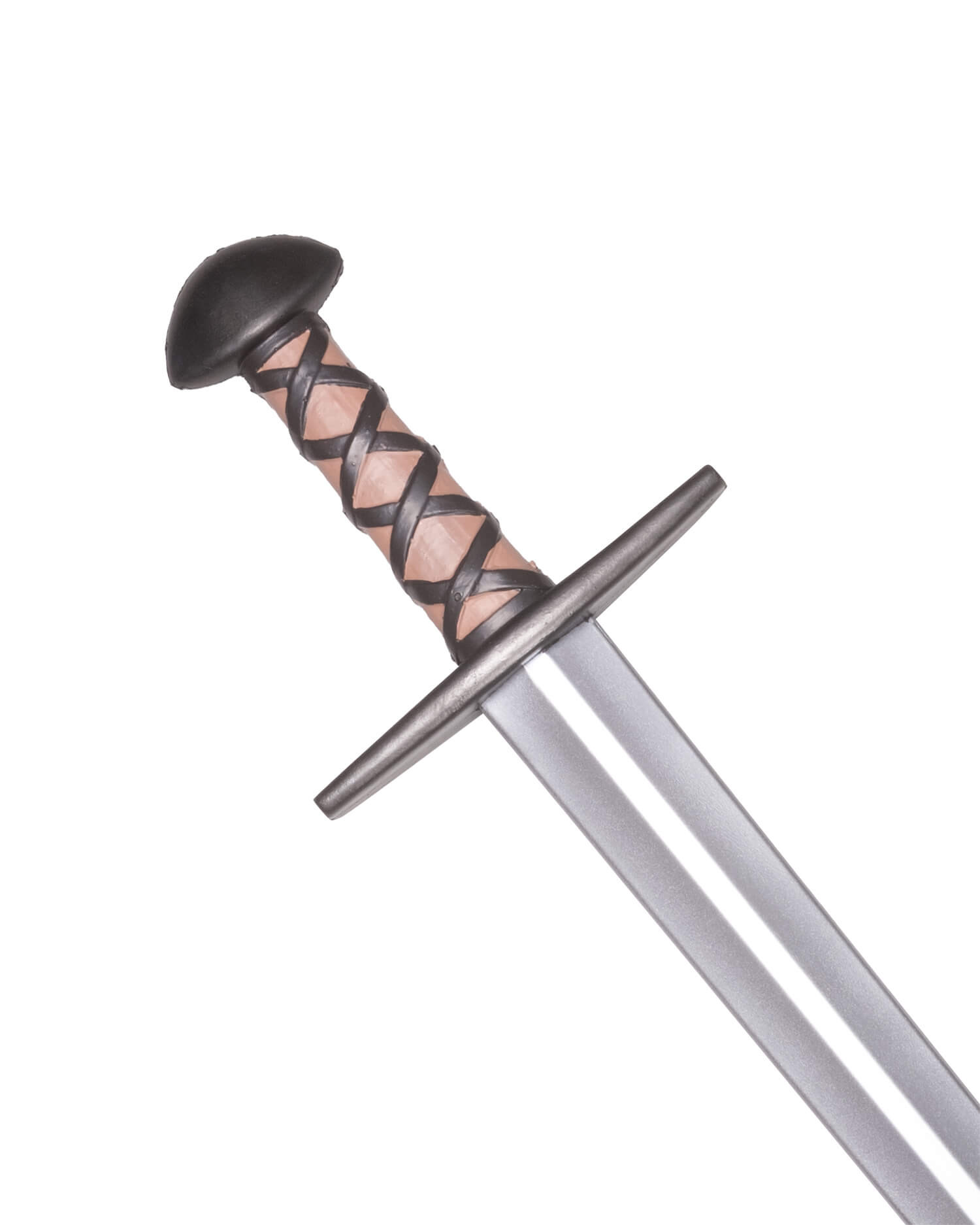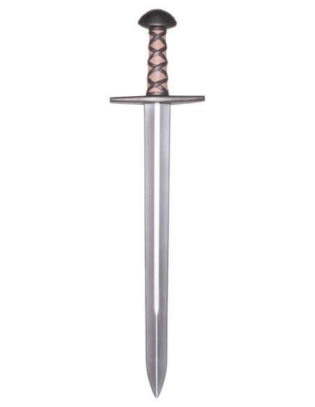 Visually, it conveys authenticity: a straight double-edged blade with a central groove that gives it character, a simple metallic guard, and a rounded pommel that provide a sober and functional look. The grip, decorated with dark cross-woven strips over a light brown base, offers a secure and comfortable hold, designed to maintain control even in intense confrontations.