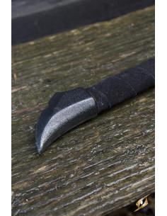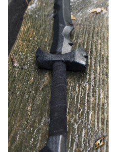 The 67 cm curved blade of this sword is equipped with numerous teeth and splinters, giving it a fearsome and used look. In addition, the slightly sloping cross guard extends into claws to protect the long handle wrapped in black split leather. The handle has an oval shape that allows you to move your hands easily and have a perfect grip at all times.