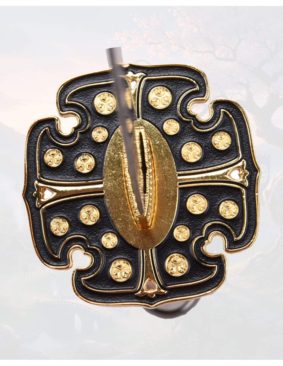 The handle, carefully wrapped and decorated with tones of beige, black, and gold, offers a grip that conveys authenticity and comfort every time you handle it, while the circular golden guard adds a touch of distinction that reinforces the classic style. The braided cord at the top of the sheath not only enhances the aesthetic finish but also allows it to be held or hung securely, designed for those who value both appearance and practicality.