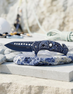 This is not just a tool, but the vehicle that transforms your perception of protection and efficiency. The 8.90 cm blade made of stainless steel, with a blue finish and stone texture, offers a sensation that speaks of resistance and confidence. The oval holes not only relieve its weight but also add a bold character. The decorative relief design, depicting a skull with blue and beige details, reinforces that attitude of dominance and determination. With an ergonomic handle, precise reliefs, and a clip to attach it to your belt, this piece becomes an extension of your will to be prepared, an imminent action tool, your ally in any emergency.