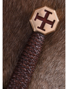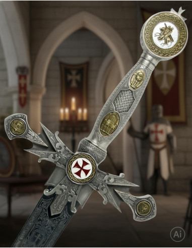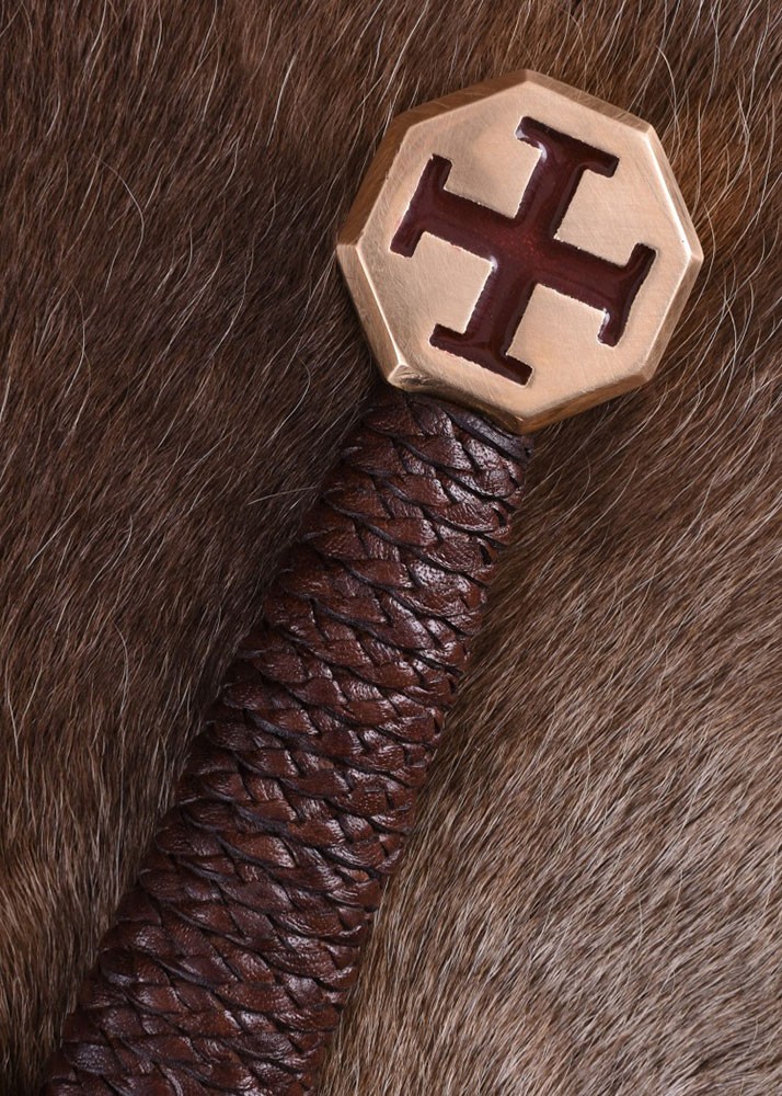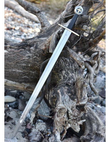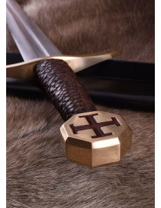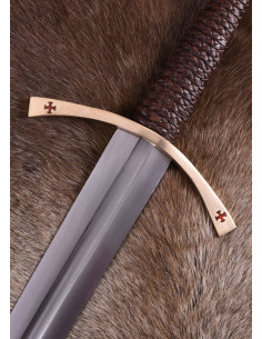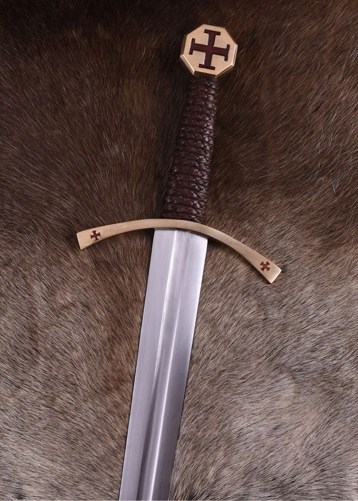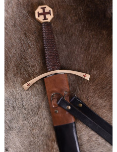 The sword has a wooden hilt covered in braided leather, giving it an authentic look and comfortable to hold. The octagonal guard and pommel are made of solid brass and decorated with the enameled Templar cross, an iconic symbol of Crusader times.