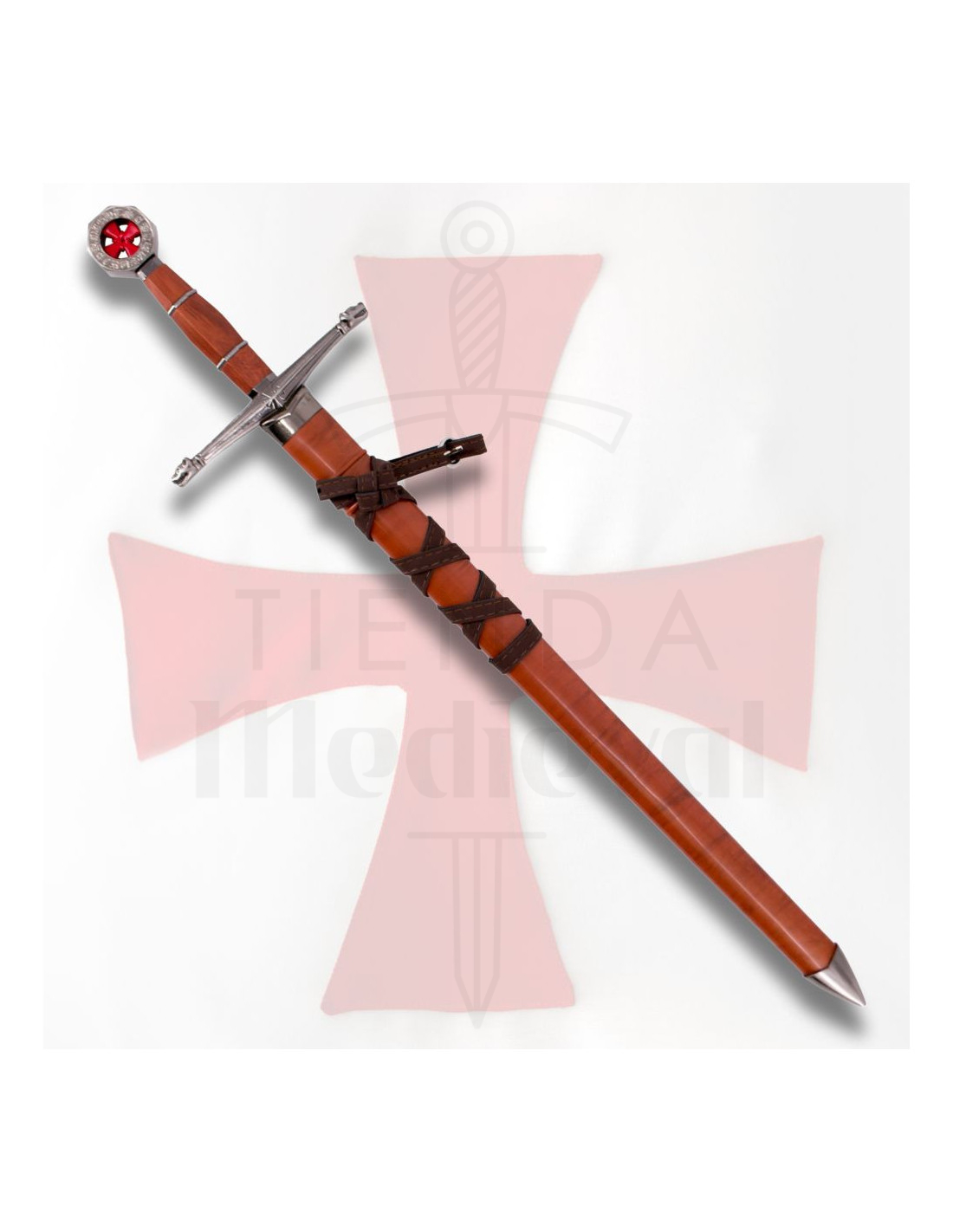 The pommel and guard have a shiny nickel finish, complementing the brown handle that offers a comfortable and secure grip. A white Templar cross stands out on the pommel, a detail that connects to the rich history of the Templar knights, famous for their bravery and loyalty. Alongside this piece, the leather-look brown sheath adds functionality, allowing the sword to be carried comfortably thanks to its practical strap.