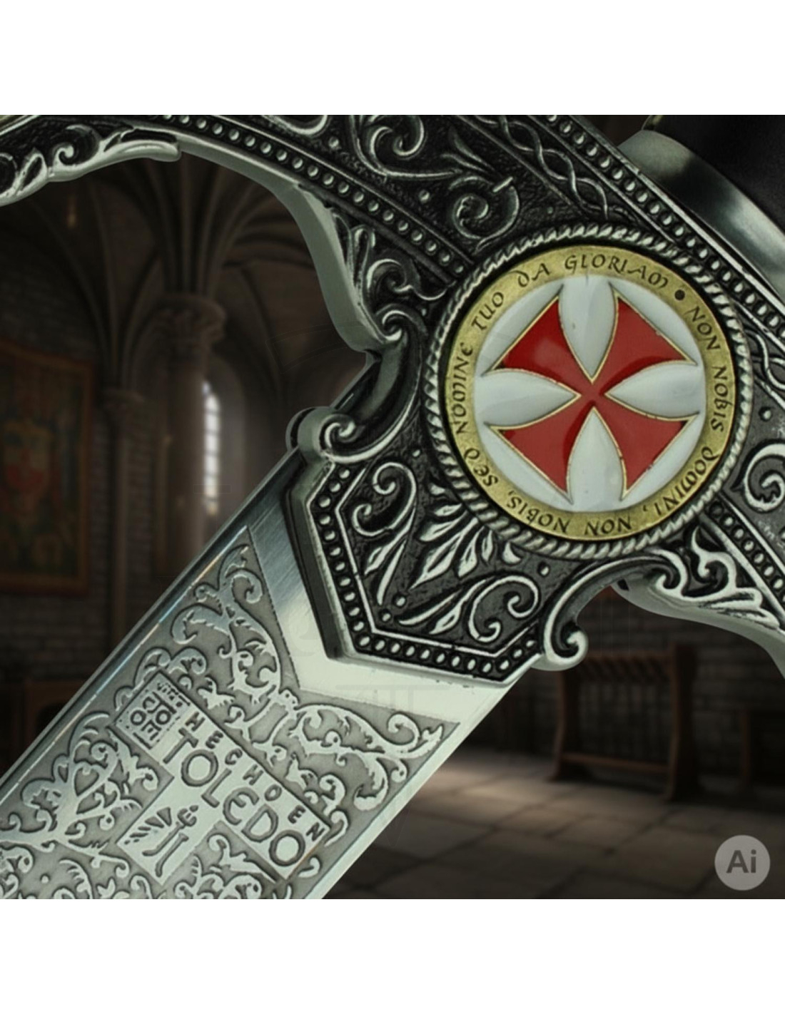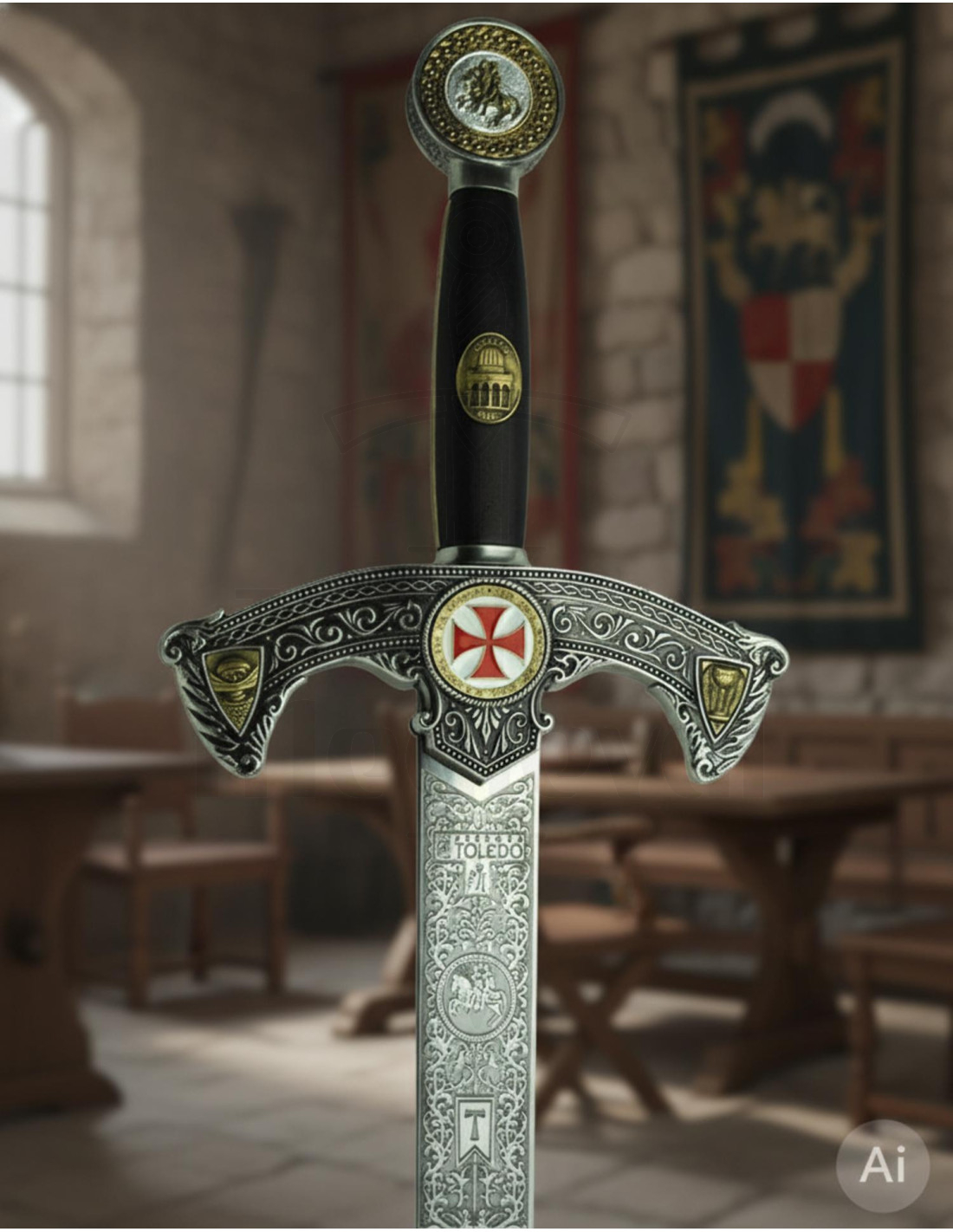 Discover the decorated Templar Sword, a true gem for lovers of history and medieval culture! This sword, made entirely in Toledo (Spain) by the prestigious swordsmith José Luis Rubio, is a true work of art.