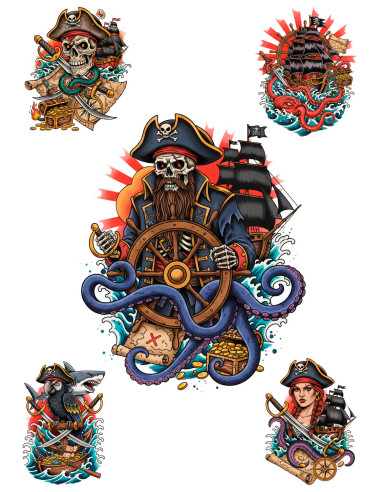 Are you looking for a fun and daring touch without commitment? This colorful pirate-themed temporary tattoo will make your style sail into new adventures. Perfect for adding a bold look at parties, events, or just to stand out among friends, its vibrant and detailed design on an A4 sheet ensures a striking visual on any part of the body.