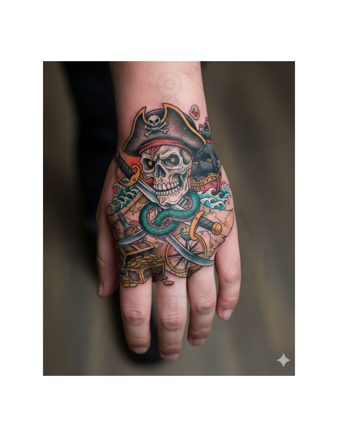 Inspired by the pirate universe, full of colors and eye-catching details, this tattoo will transport you to adventurous seas without permanence. Whether for a party, a themed event, or simply to wear something original, purchasing this temporary tattoo guarantees quality, durability, and fun. Dare to sail in style without compromising your skin!