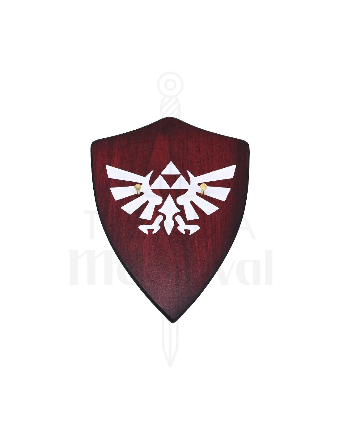 This Wall Display Stand for Link's Master Sword offers an elegant and understated presentation, ideal for those looking to proudly display their replica. The shield-shaped plaque, in a dark brown with natural veining, adds warmth and character, while the beveled edge in an almost black tone frames the piece as if it were a relic. The stylish white motif in the center adds distinctive contrast, and the small golden metal hooks allow for hanging accessories or securing details without breaking the aesthetic.