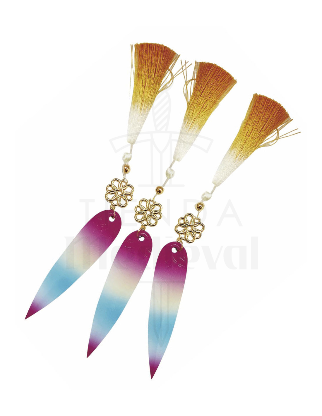 The image shows three aligned ornaments, each topped with a fringed gradient from orange to white, adding movement, tied to a six-petal golden flower that serves as a focal point. From that flower hangs an elongated piece with a gradient from blue at the tip to purple at the top, creating an elegant and dynamic contrast.