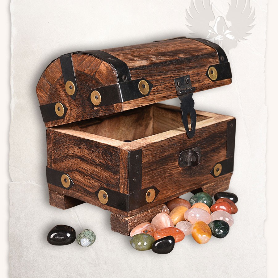 This chest, more than a simple accessory, is a deliberate act of style and authenticity. Thanks to its construction in high-quality wood, reinforced with brass and adorned with vibrant semi-precious stones, it becomes a statement of durability and good taste. Every detail, from its dimensions (7x10x9 cm) to its lightweight (130 g.), has been designed so you can always have it handy—on your desk, shelf, or bag—and feel secure that your story and objects are protected with a touch of history and distinction. The elegance of craftsmanship and the nobility of its materials make each glance linger on this piece, filling every corner with character, translating into confidence and presence in any space.