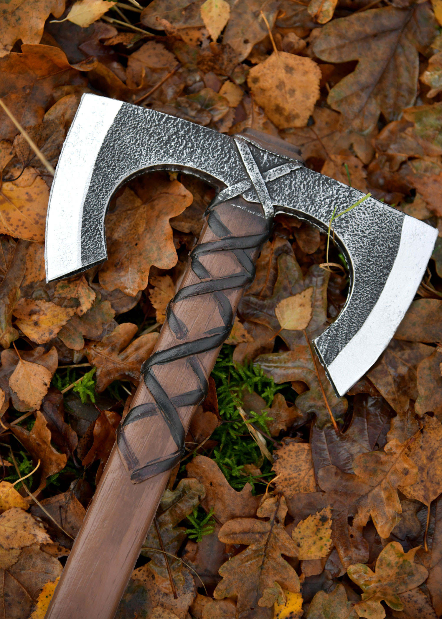 The finish that mimics rough metal and the lighter tips provide a striking visual presence, perfect for those seeking realism in every detail. The wood-effect handle and the crossed lacing near the head convey historical authenticity, while the lower section wrapped in non-slip material enhances grip, preventing fatigue and allowing safe maneuvers.