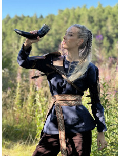 If you are looking for a quality and stylish Viking belt, the brown cotton Elina model is an excellent choice. With a width of 5 cm and a total length of approximately 235 cm, this belt is long enough to accommodate different waist sizes and wearing styles. In addition, its classic and elegant design is inspired by Viking culture, making it a key piece for any lover of history and medieval fashion.