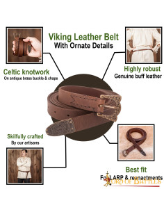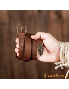 Discover the Viking Authenticity with the Narrow Belt in Brown Color with Buckle and Plate! Have you ever imagined Viking art at its most intricate? Our handmade medieval leather belt, with antique brass buckle and plate, embellished with detailed Viking knotwork, will fit right into that image.