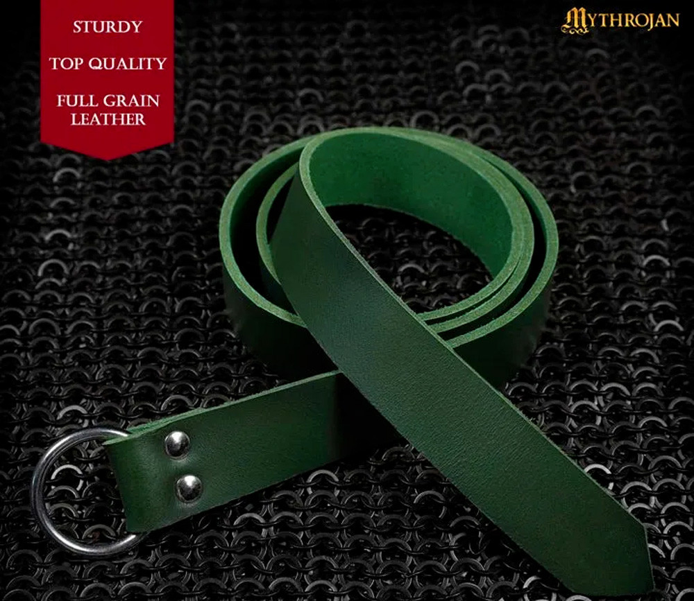 This viking belt with a round buckle in green is a piece that perfectly combines durability and style. Handcrafted from full-grain leather, it stands out for its artisanal construction, ensuring a superior quality product, ideal for completing your outfit, whether historical or fantasy. The leather of this belt, besides being attractive, offers unmatched durability, designed to accompany you on all your adventures.