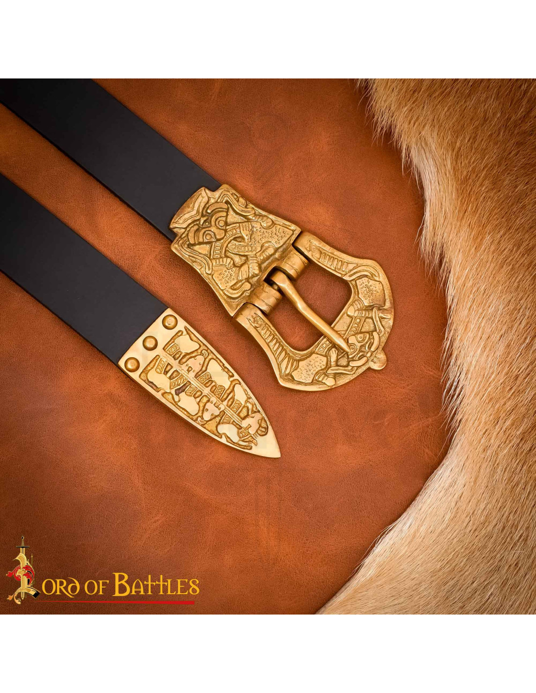 Black Leather Viking Belt with Ornate Brass Buckle and Tip