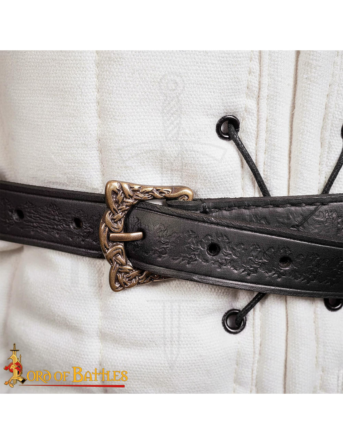 Designed for those who value fit and discretion, its medium profile offers ideal compatibility with both traditional and casual garments, maintaining a clean line that enhances the silhouette without adding unnecessary bulk. If you're looking to buy a Viking leather belt in black embossed with an antiqued brass buckle, you will find this piece combines history, practicality, and distinctive style that makes a difference.