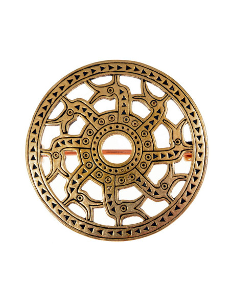 This reproduction closely follows a Germanic decorative disc that reached the Roman-Germanic museum in Cologne, inspired by pieces dated to the late sixth and early seventh centuries. From the collection of Baron von Diergardt, the motif in the form of a solar wheel and animal heads evoke visual traditions maintained among Franks, Germans, and Bavarians, turning each ornament into a bridge across eras.