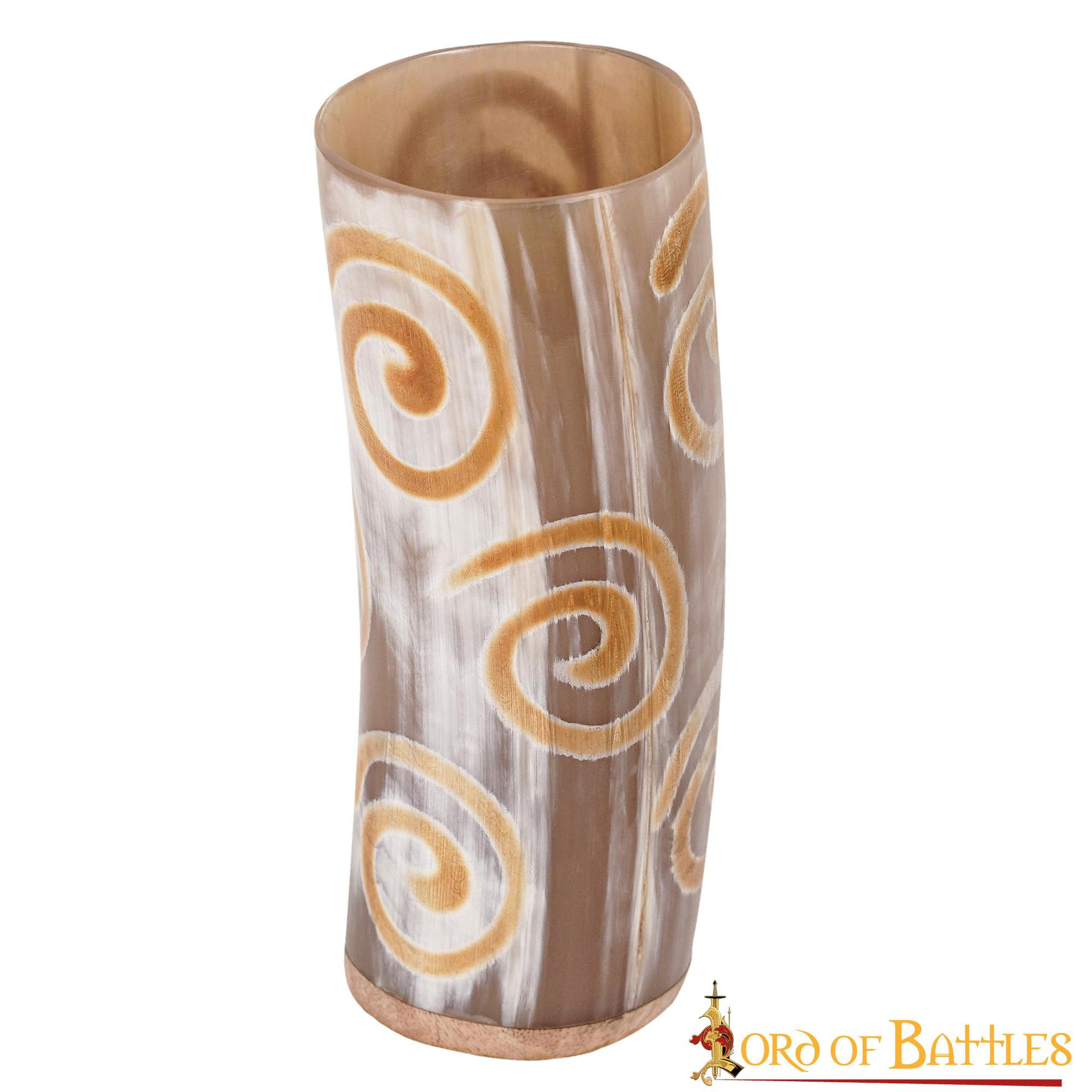 Imagine this scene: you are sitting at a wooden table, surrounded by your battle companions, enjoying an aged mead. You lift this unique glass in your hands and feel its rough and authentic texture. The burnt spiral design on the horn takes you straight back to the days of the brave Vikings.