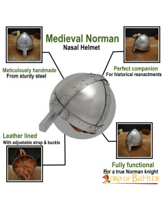 For centuries the nose helmet has been THE most popular helmet in most of Europe due to its versatility and good balance between protection and mobility. For example, it was ubiquitous in the Bayeux Tapestry depicting the invasion of Saxon England by William the Conqueror's Norman knights and footmen. Speaking of whom, a specific incident at the Battle of Hastings, illustrated on the Bayeux Tapestry, reveals how William the Conqueror had to raise his nasal helmet to show his troops that he was still alive after rumor of his death had spread. spread out in his army.