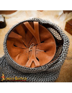 Its design includes an adjustable visor and a 10 mm riveted chainmail cape that drapes down to provide additional protection for the neck and shoulders, just like in true Viking armor. The curved shape and decorative details, with metal rivets on the helmet, highlight that warrior aesthetic that will catch everyone's attention.