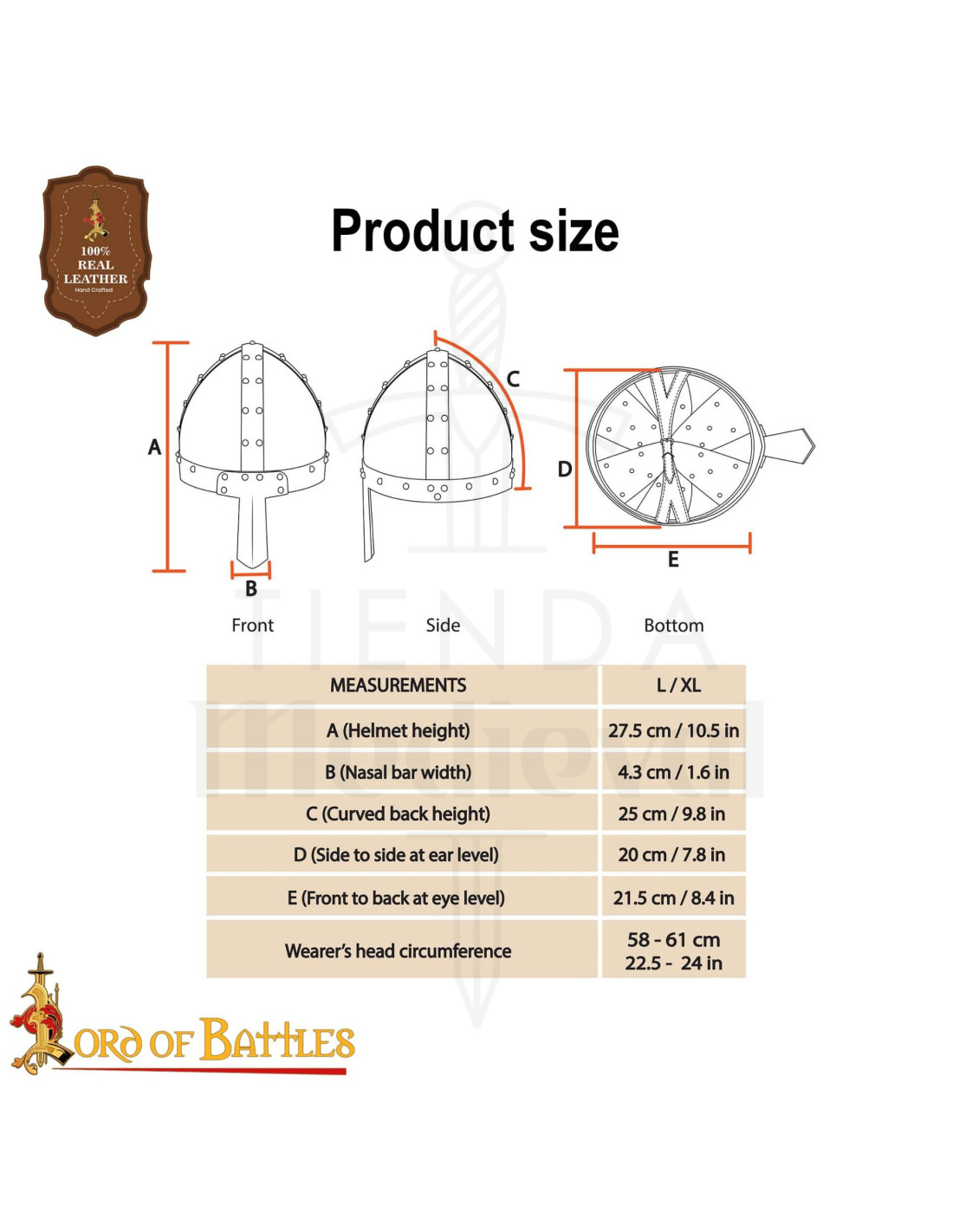 Weighing approximately 2.5 kg, this helmet is durable yet manageable, ideal for cosplay, historical reenactment, or collection. Inspired by the 11th-century Norman conquest period, its silver finish and rivet details make it an authentic piece that stands out in any display. Additionally, the 'Lord of Battles' brand guarantees quality and historical fidelity.