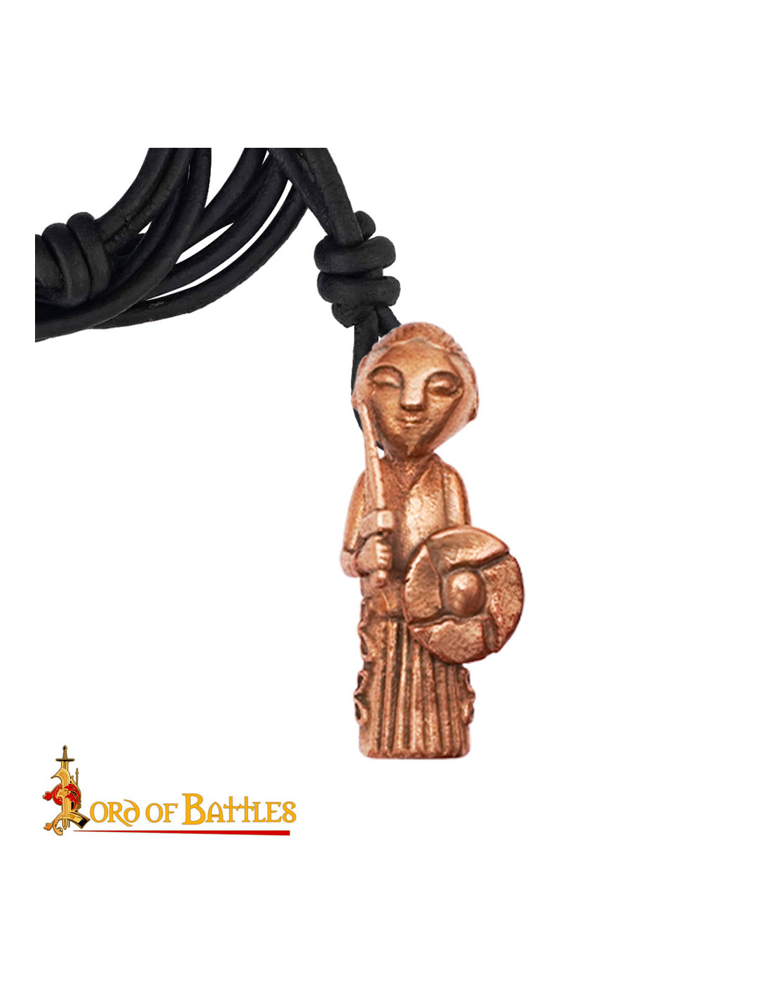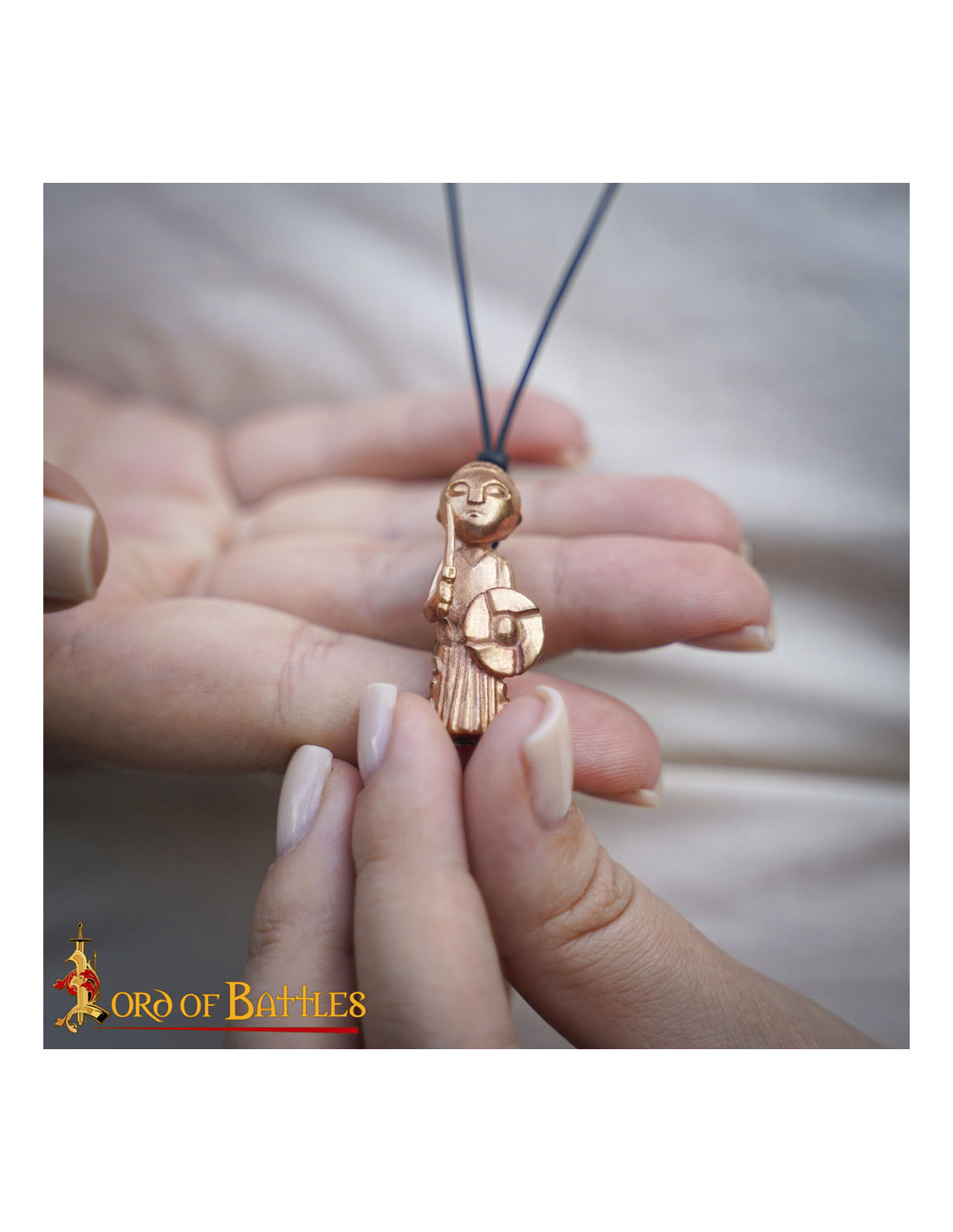 The design of the pendant features the figure of a Valkyrie with her shield and weapon, emblematic elements that evoke power and protection. The shield, with raised details, gives it a unique decorative touch, while the weapon, possibly a spear, symbolizes the skill of these imposing warriors. This level of detail makes the piece an ideal accessory for those who value history, fantasy, or seek a jewel that tells a powerful epic story.