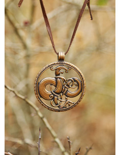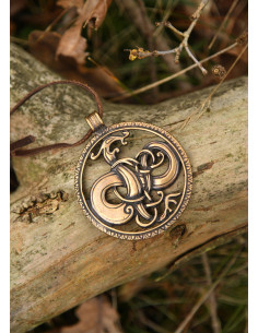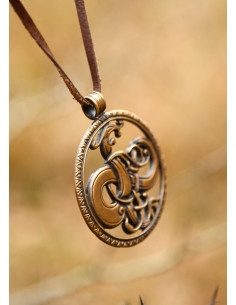 This magnificent pendant is meticulously crafted in bronze, achieving a perfect balance between sturdiness and elegance. The aged finish not only gives it an authentically medieval look but also makes it an extraordinary accessory that easily adapts to various styles. You can pair it with a simple chain or a leather strap, ideal for adding that rustic touch characteristic of Viking jewelry.