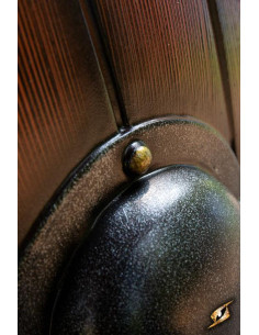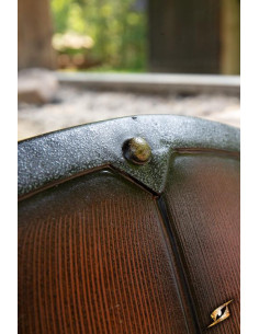 This shield features a wooden face and a smooth texture, which is complemented by an iron paint finish. Its slightly convex shape and iron ledge at the front not only give it an impressive look, but also give you an edge in combat. You will be able to face your enemies with confidence, knowing that you have a strong and durable shield.