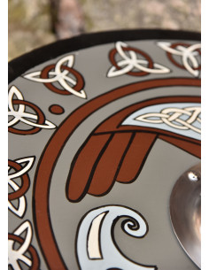 Round Viking Shield with Raven and Triquetras Motif, 61 cm Ø. The beautiful Viking shield that we offer you here is made of approx. 13mm thick plywood, covered in linen and elaborately embellished with so-called triquetras (clover or trinity knots) and ravens.