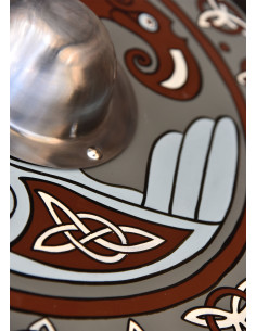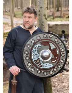 At its center, the shield features an oversized steel bulge that is held firmly in place with four rivets and leaves enough room to accommodate even the strongest of Viking hands. The back of the shield is painted black and provided with a solid wood handle.
