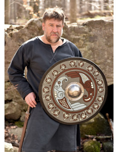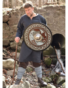 Although this early medieval wooden shield may be a bit too light and thin for full contact, it is still a great prop for re-enactment, LARP, stage or TV/film and will make your transformation into a proud Norse warrior simply perfect. In addition, it is also a nice collector's or display piece for all Viking Age enthusiasts.