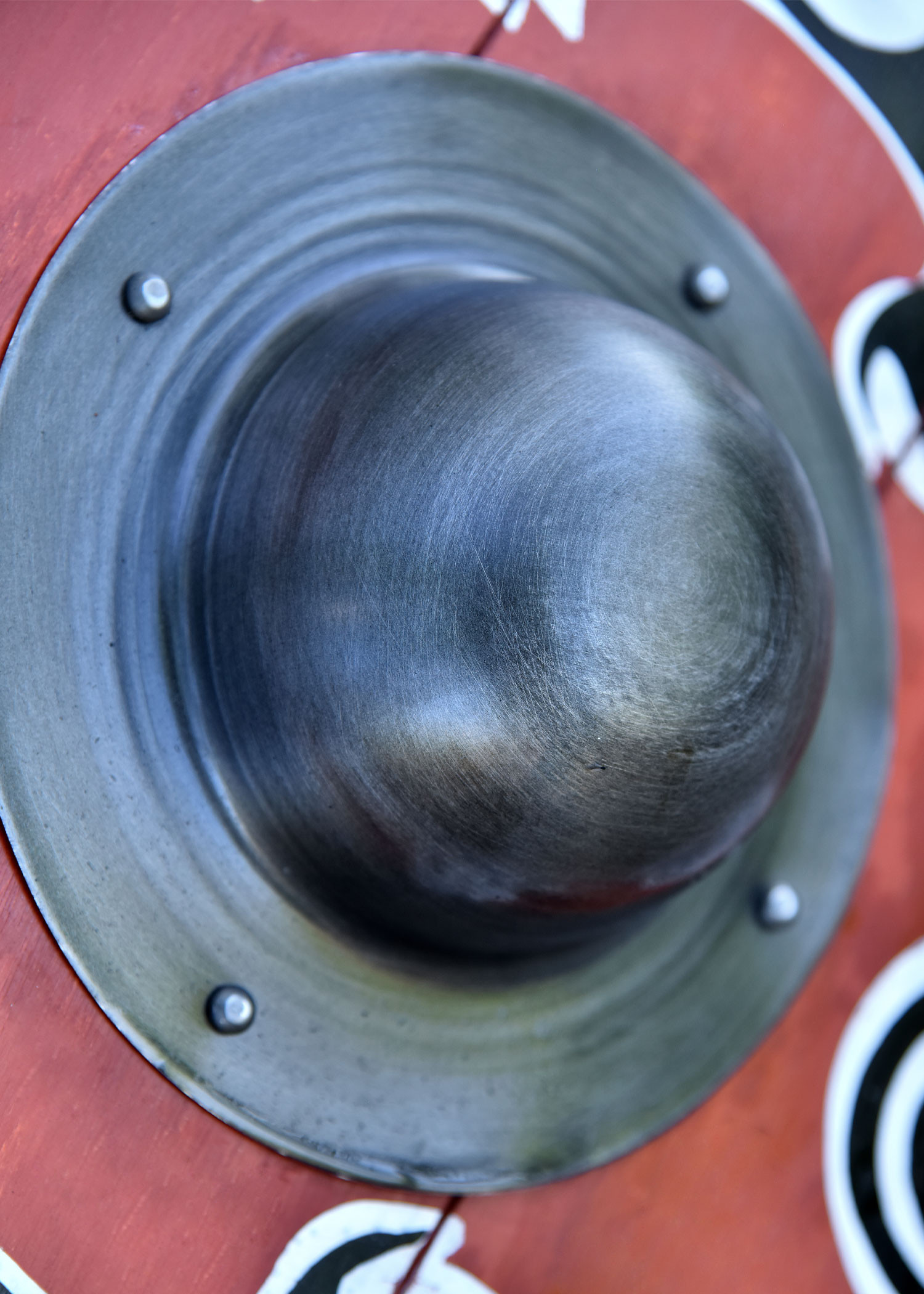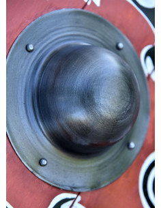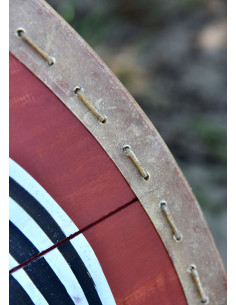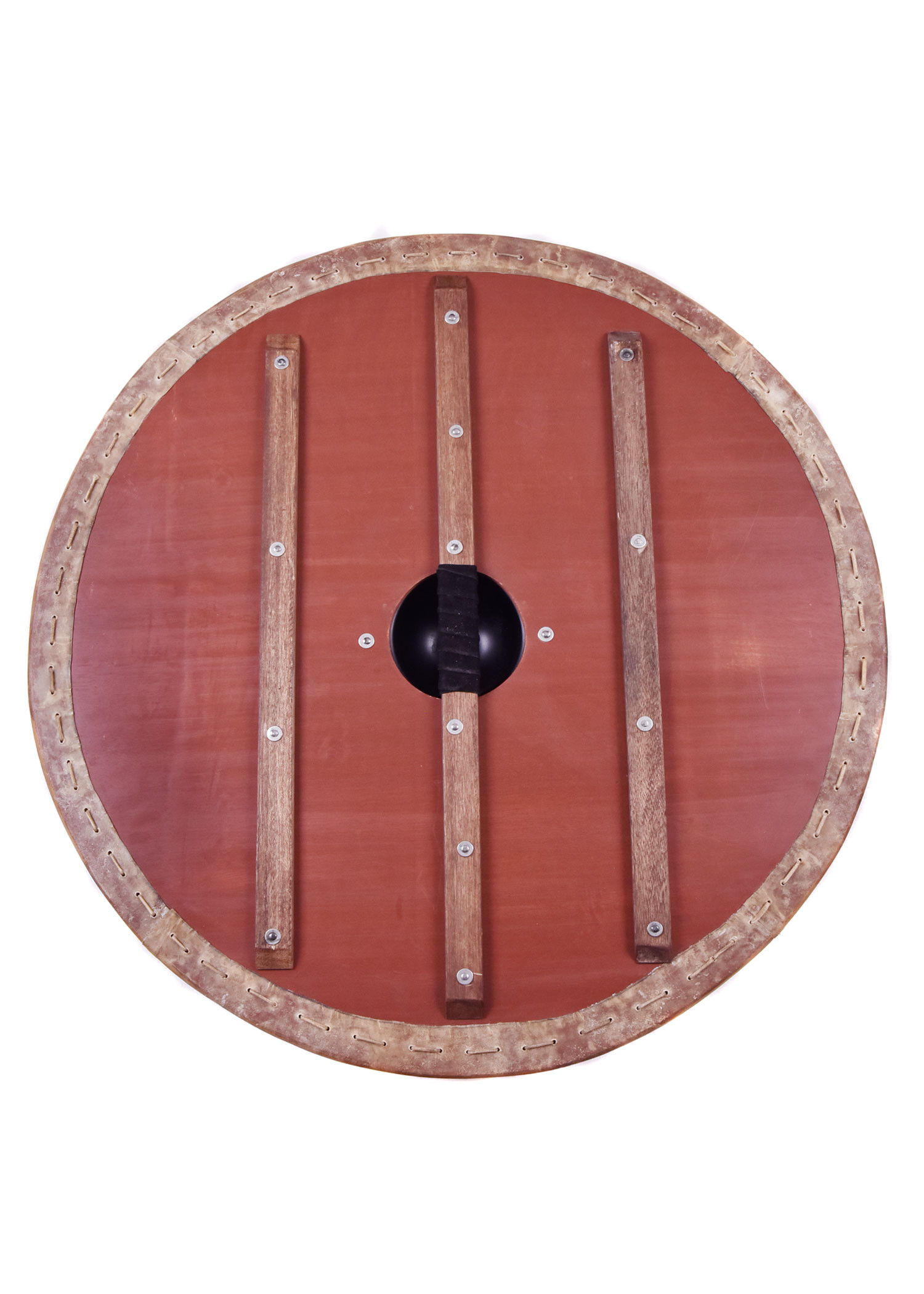 At its center, the shield features a large steel bulge that is held firmly in place with four rivets and leaves enough room to accommodate even the strongest Viking hands. The edge of the shield is lined with rawhide (parchment), and the back is fitted with three riveted wooden reinforcing strips. The central strip also serves as a handle and is lined with leather in its middle part for a comfortable grip.