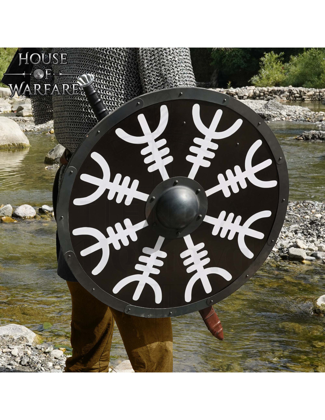 The black and white finish, featuring the Aegishjalmur symbol, dominates the surface, showcasing eight emblems perfectly symmetrical around a central metallic boss, giving it an authentic and visually striking appearance for photos, film shoots, or displays.