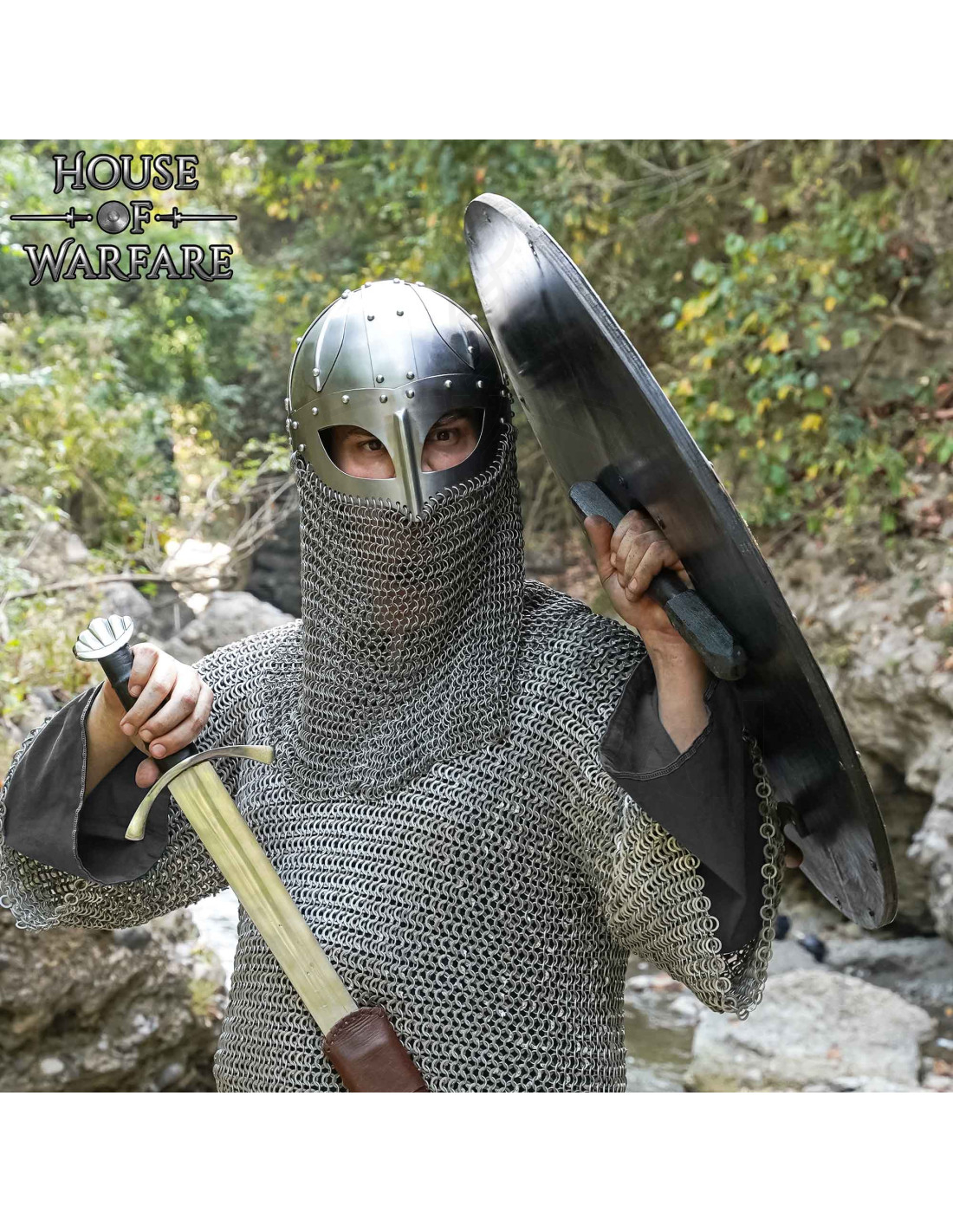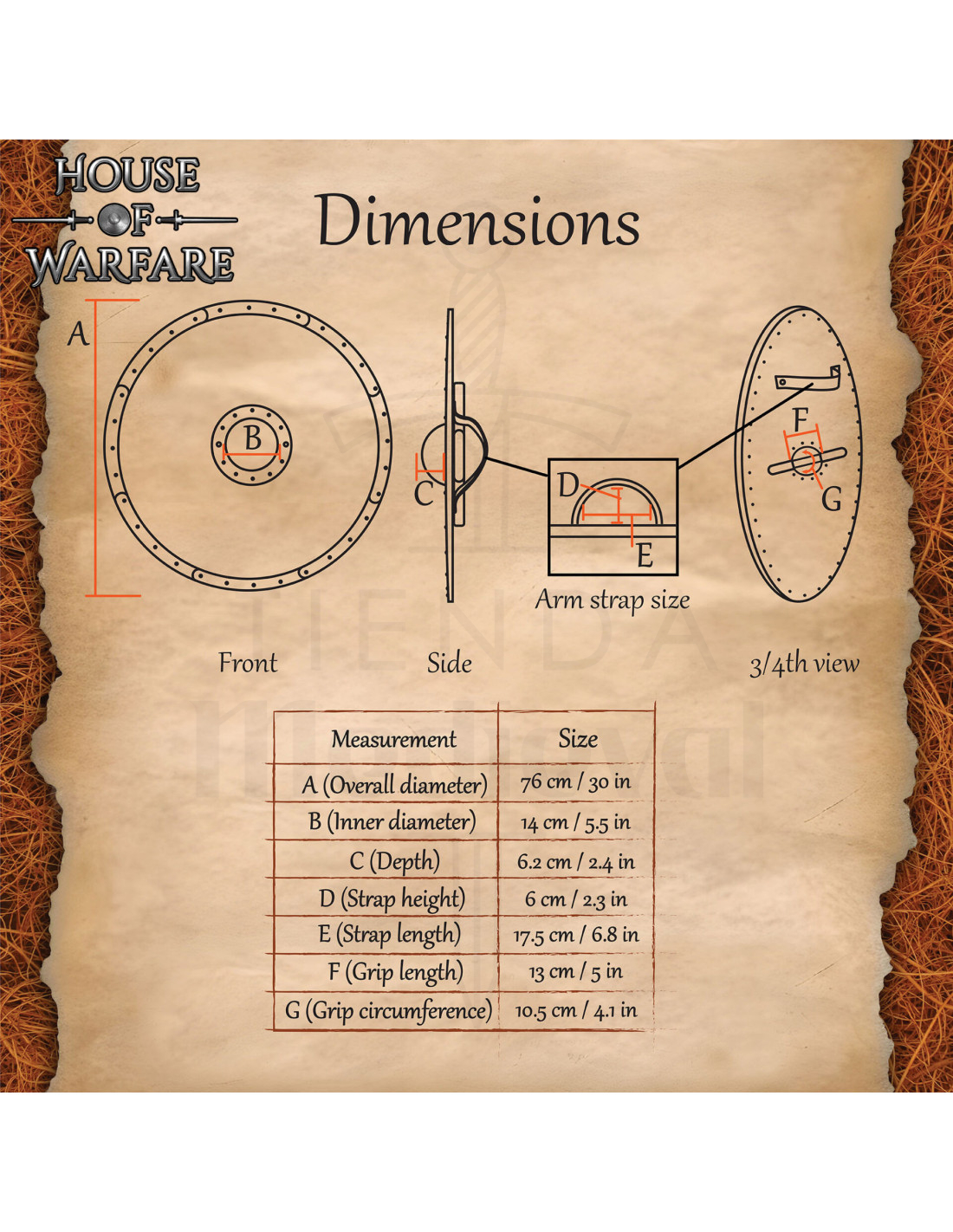 The domed boss and the riveted edge provide effective protection for the hand and perimeter, extending the product's lifespan even with repeated use, while the visible rivets enhance the warrior look that appeals to collectors and enthusiasts alike.