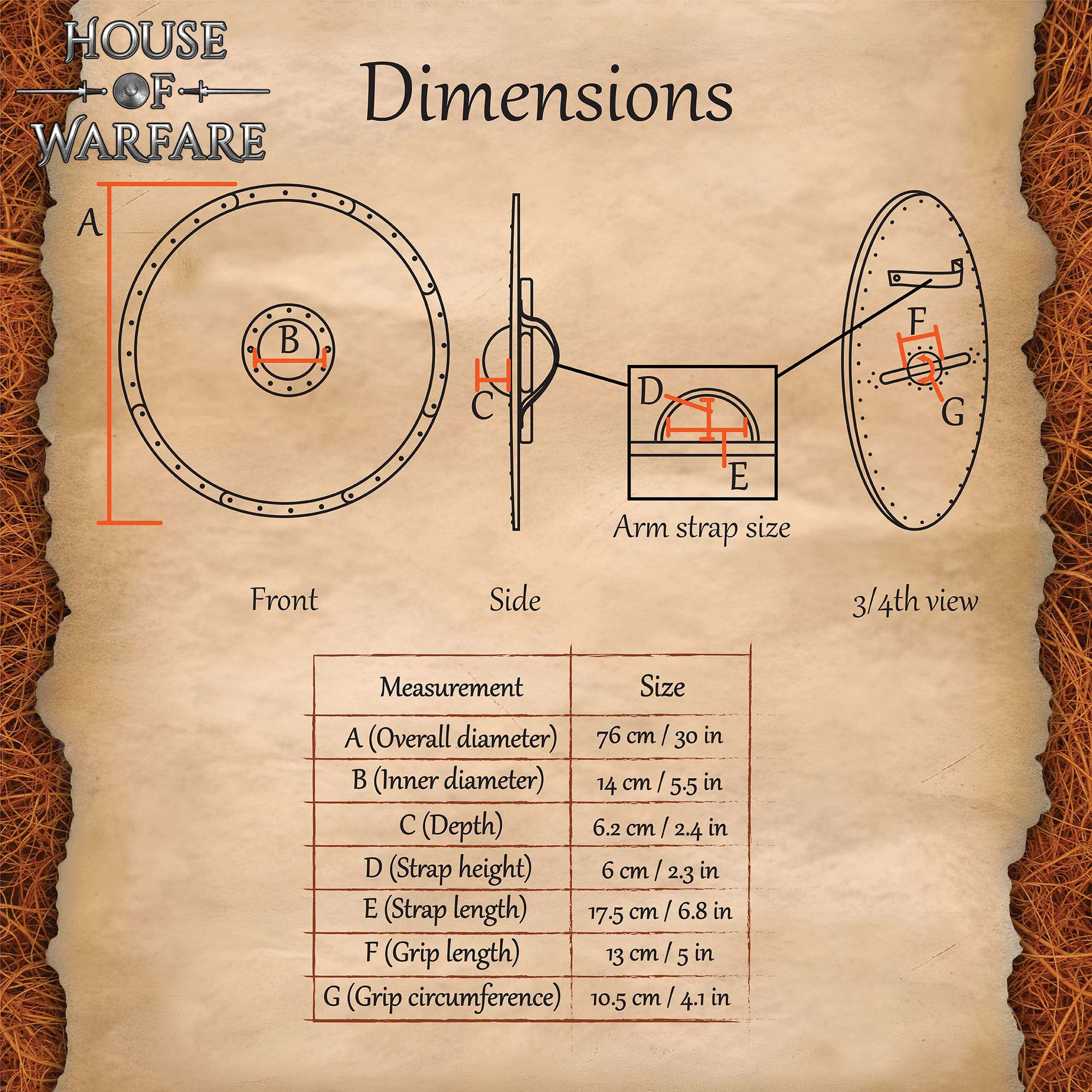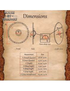 The riveted metal rim around the edge not only adds an authentic look but also ensures greater impact resistance, resulting in a durable appearance and a sense of confidence while handling it. The visible rivets and the central umbo protect the grip area, allowing for safe and comfortable handling in any activity.