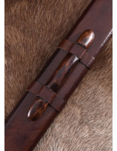 The wooden hilt covered in brown leather offers a firm and comfortable grip, allowing you to wield the sword with dexterity and precision. Additionally, this classic design is completed with a beautiful leather-wrapped wooden scabbard, which not only allows you to carry the sword safely and comfortably, but also enhances its imposing appearance.