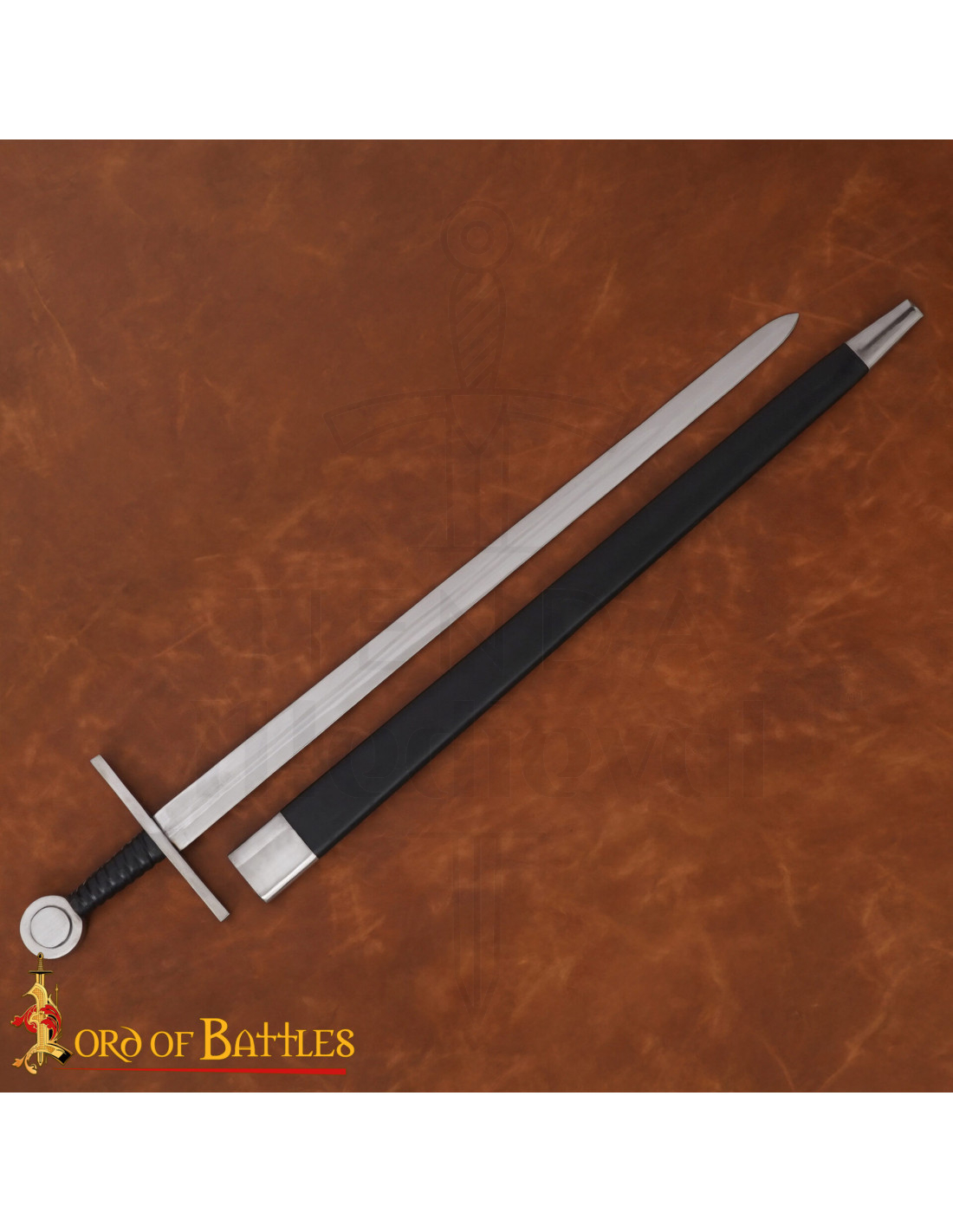 This Handcrafted Viking Medieval Sword with Sheath offers the rugged and realistic aesthetic of Nordic weapons, without the need for complex maintenance or care for battle use. The blade, handcrafted using traditional techniques and marked by a central groove, provides an elegant silhouette that catches the light and adds visual depth, perfect for showcasing on a wall or in a display case. The handle wrapped in leather gives an authentic grip and comfortable handling for photo sessions or reenactments, while the straight guard and disc pommel complete a simple and functional line that harmonizes with rustic and contemporary decor.