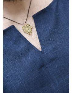 Its design features a classic round neck with a central opening that you can leave open or close with a brooch for a personalized touch. The side openings enhance freedom of movement, ensuring comfort in any activity. The linen fabric, with its natural and sturdy texture, adds authenticity and a rustic style that fits perfectly with Viking or medieval attire.