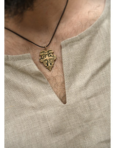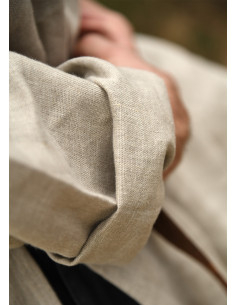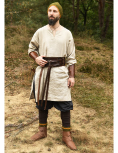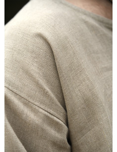 The design features a classic round neck, complemented by a central opening that you can wear open or close with a brooch for a distinctive touch. The side cuts provide great freedom of movement, while the natural texture of the linen adds a rustic and authentic character that enhances any medieval or Viking outfit.
