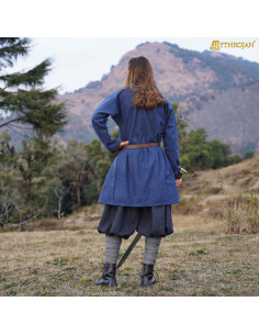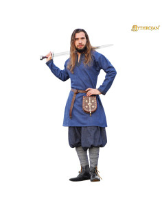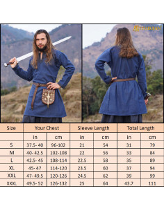 Its vibrant blue color and thoughtful details, such as the contrasting cuffs and traditional cut design, make it a versatile piece that you can integrate into a wide variety of medieval outfits. And if you're looking to complete the look, pair this tunic with wide pants and historical boots like those worn by the model.