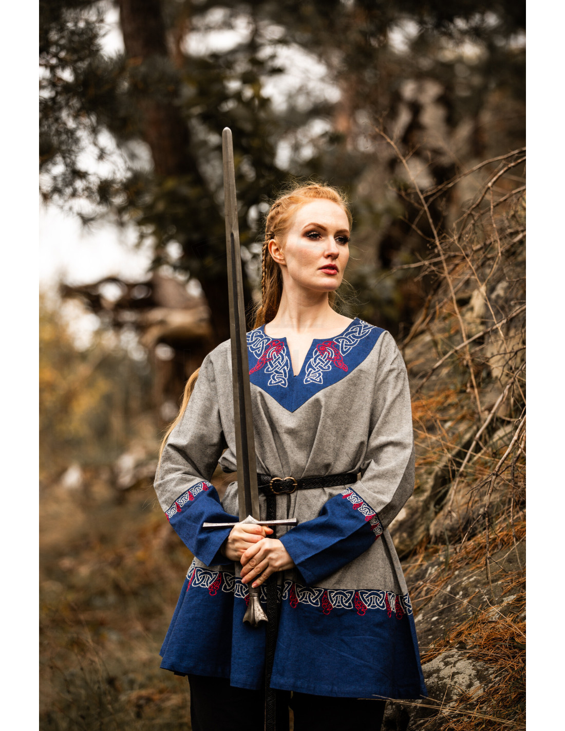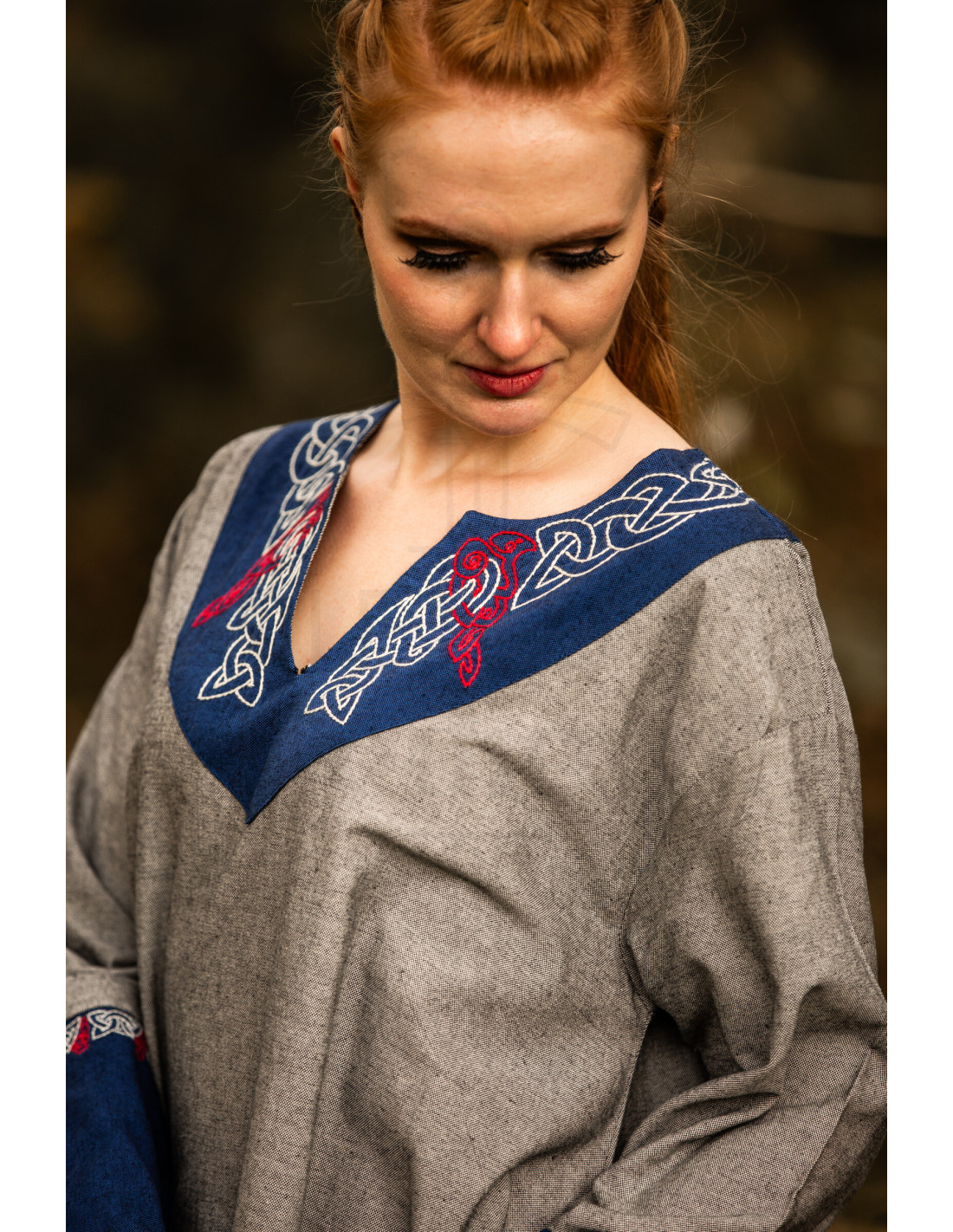 Inspired by rich Nordic traditions, our tunic stands out not only for its stunning design by Leonardo Carbone but also for its detailed hand embroidery on the V-neckline, long sleeves, and hem. Each of these details is a work of art that reflects Viking heritage, creating a connection with the indomitable spirit of ancient northern warriors.