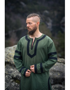 Imagine dressing with the essence of Nordic warriors and feeling every movement accompanied by comfort and style. This green tunic invites you to relive the Viking era with simple elegance but full of history.
