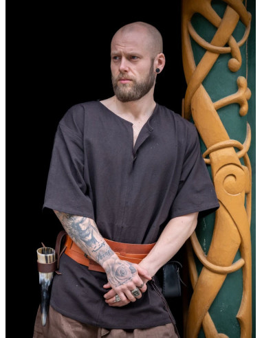 With its variety of sizes, this garment fits different styles and needs, making it versatile to pair with leather belts, medieval pants, or sturdy boots. The visual mention of the product in the image shows a navy blue garment with a V-neck, black belt, and yellow embroidery, reflecting its handcrafted character and complete look to accurately recreate the Viking era.