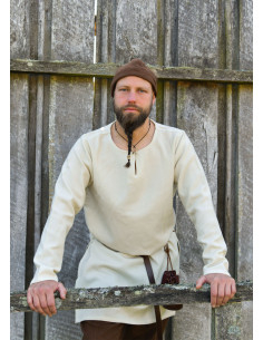 Its simple aesthetic and the light ivory tone seen in the image make it very versatile, perfect for pairing with a dark leather belt that accentuates the silhouette and adds a touch of authentic rusticity. The visible natural texture of the fabric conveys quality and a discreet presence that fits well under elaborately made outer garments or as a main layer at fairs, Viking gatherings, or historical reenactments.