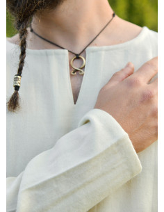 The Bjane Viking Tunic in natural wool offers practical comfort while honoring tradition: the natural wool regulates temperature, keeping you warm as the evening falls and breathable during activity, while the cut that reaches the upper thigh provides coverage without restricting movement. The side slits at the hem allow for easy movement, and the small V-neck opening lets you wear it closed with a clasp or open for a more relaxed look.