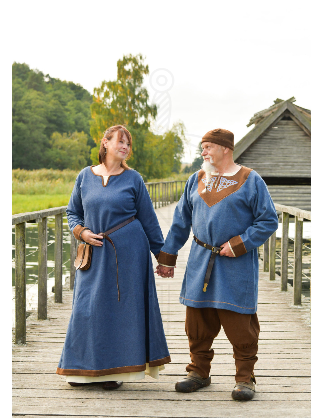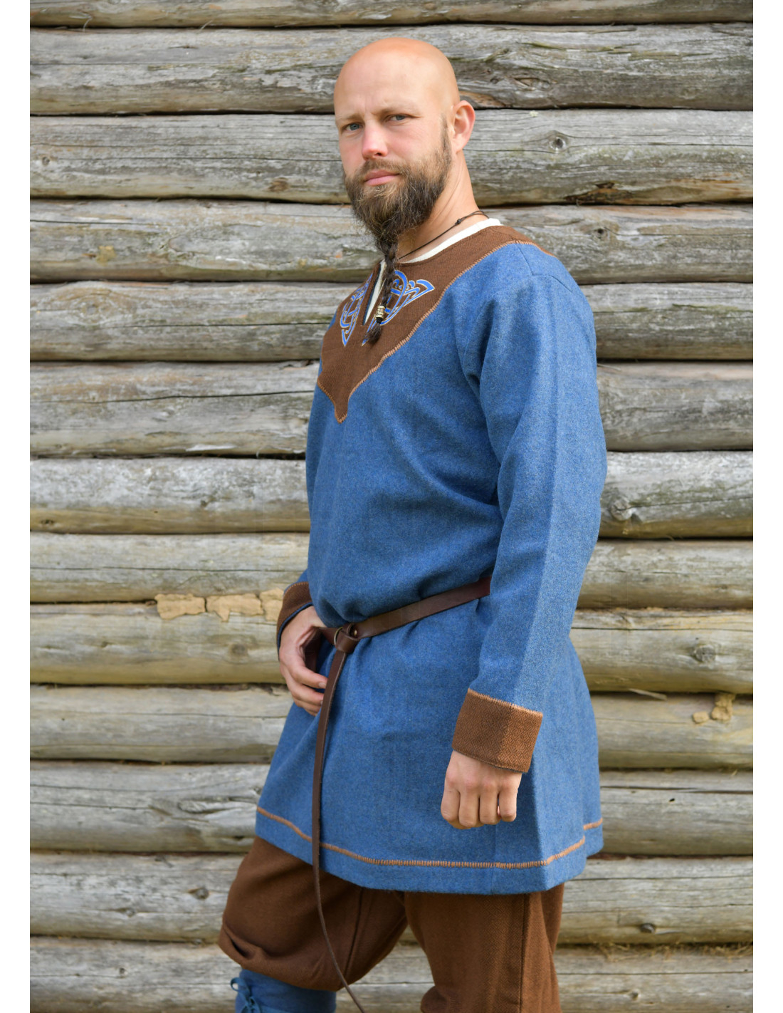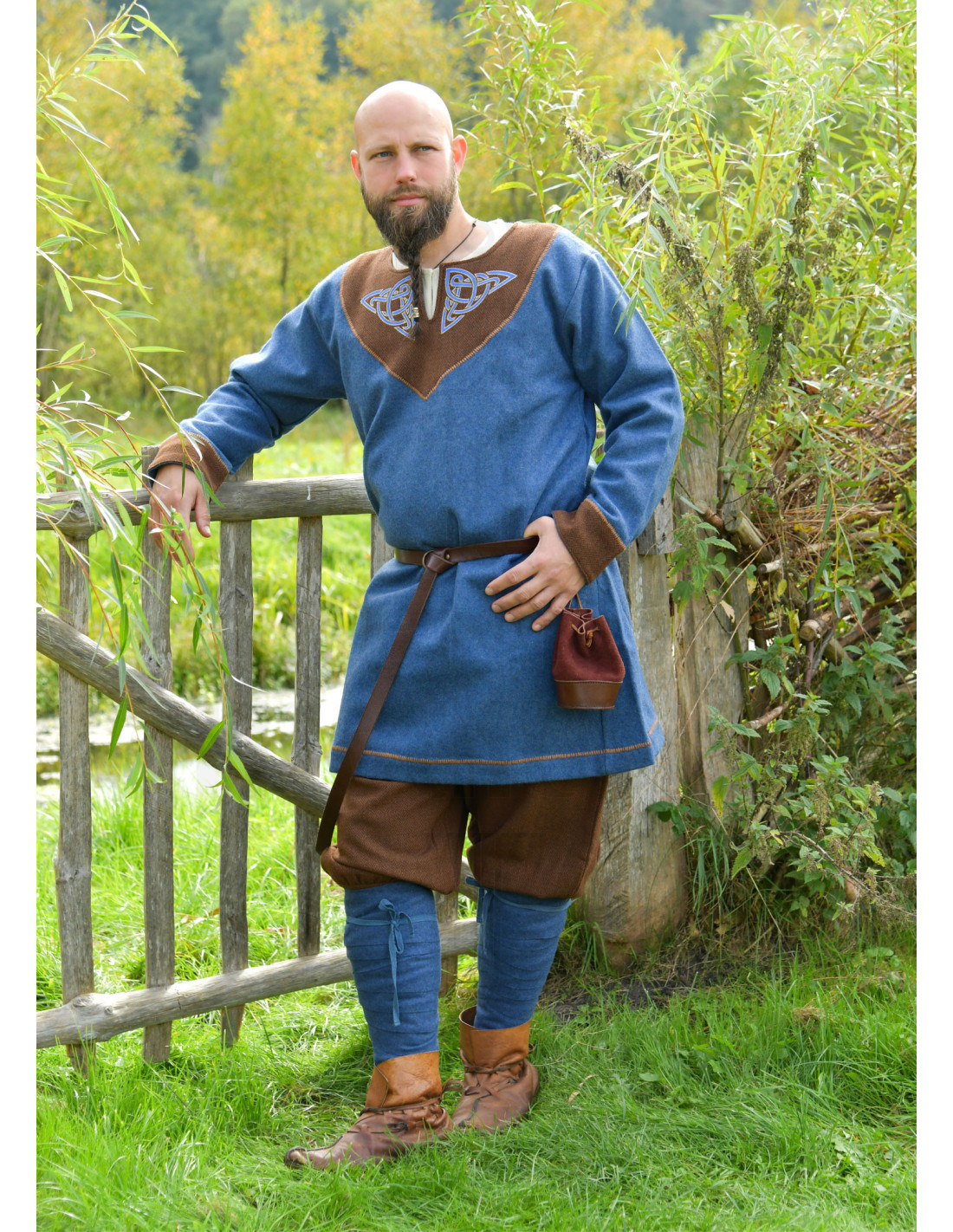 Designed as an outer garment, Esben can be complemented with a brown leather belt with buckle and metallic accessories, completing a coherent look for medieval markets, reenactments, and Viking gatherings. If you're looking to buy the Esben Blue Wool Viking Tunic with Celtic Embroidery, you will find an option that prioritizes natural materials and detailed finishing.