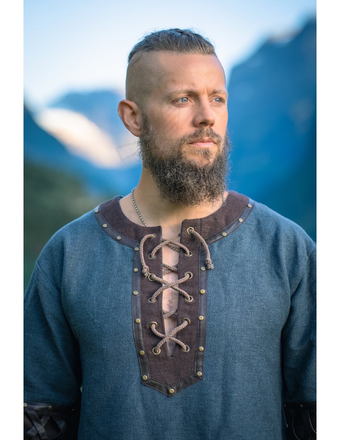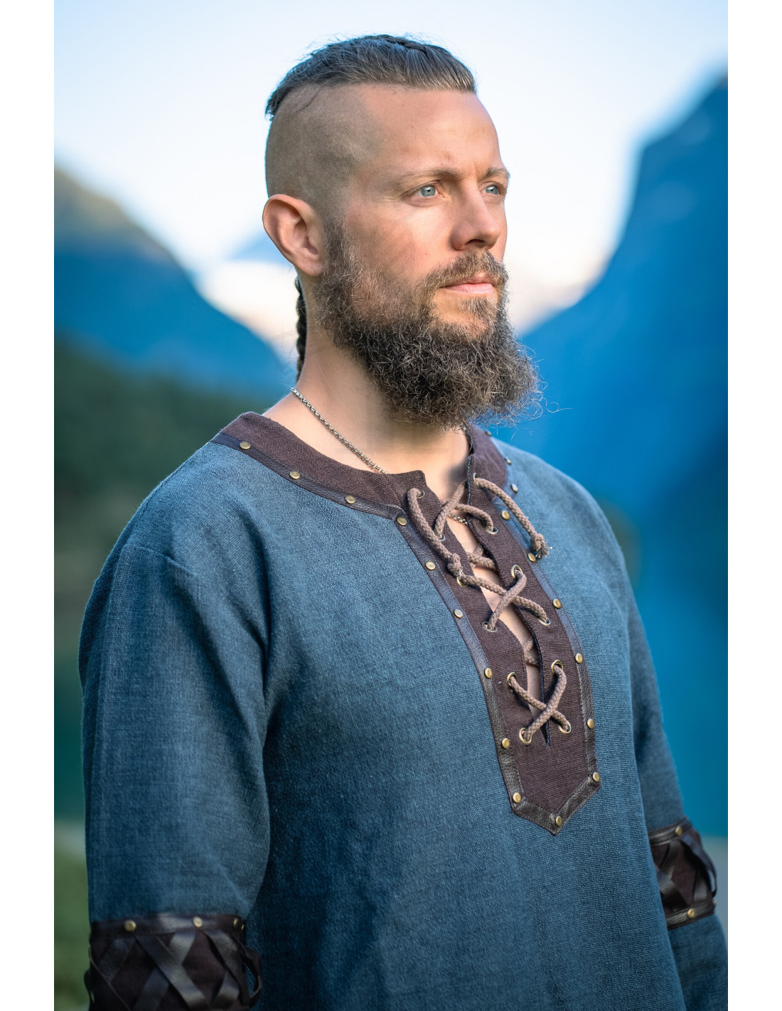 The tunic features a straight cut that is both flattering and practical, fitted with genuine leather details that enhance its visual appeal without compromising on durability. Adjustable laces allow for a personalized fit, while the carefully designed front and back slits enable ease of movement for all occasions, from reenactments to thematic events.