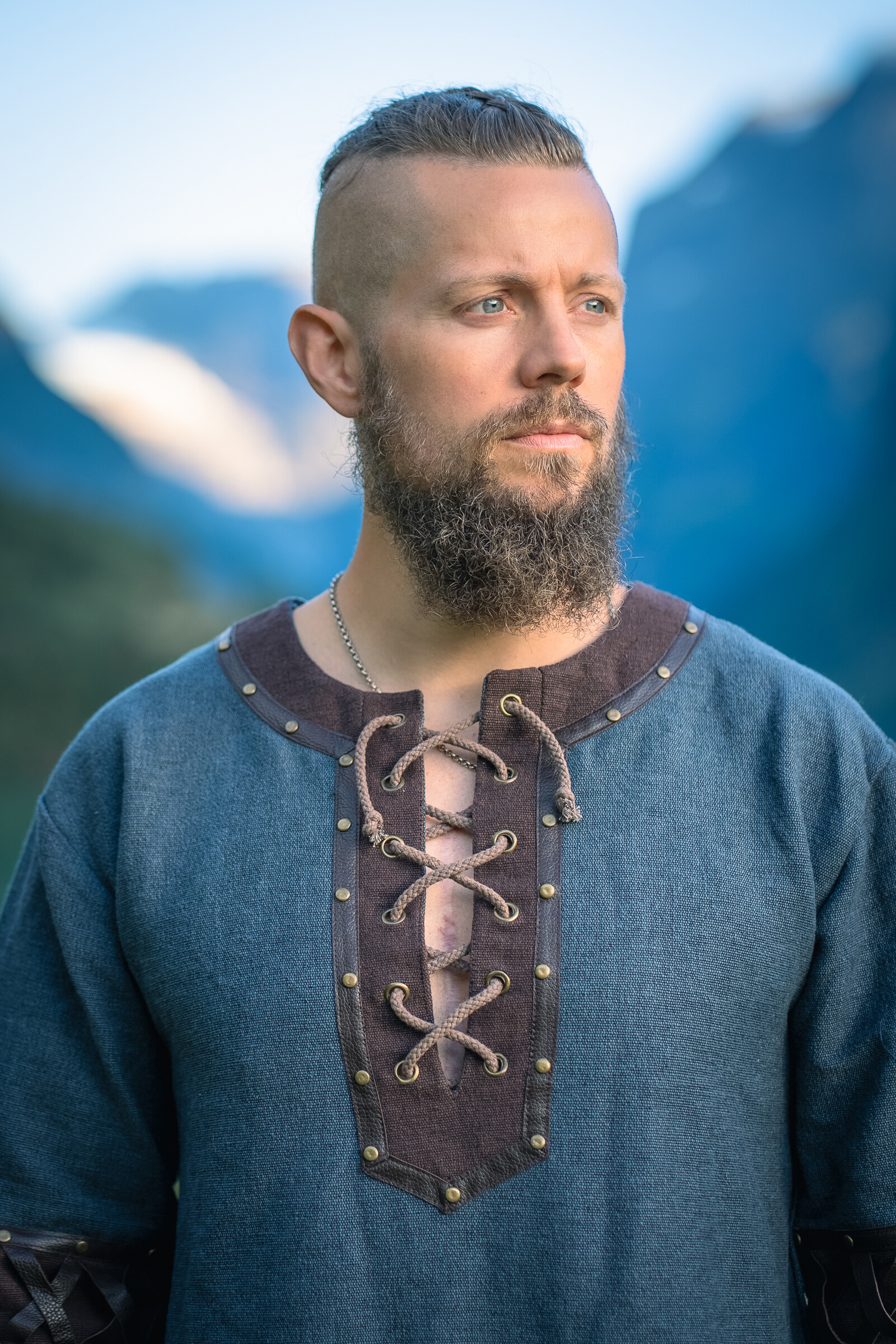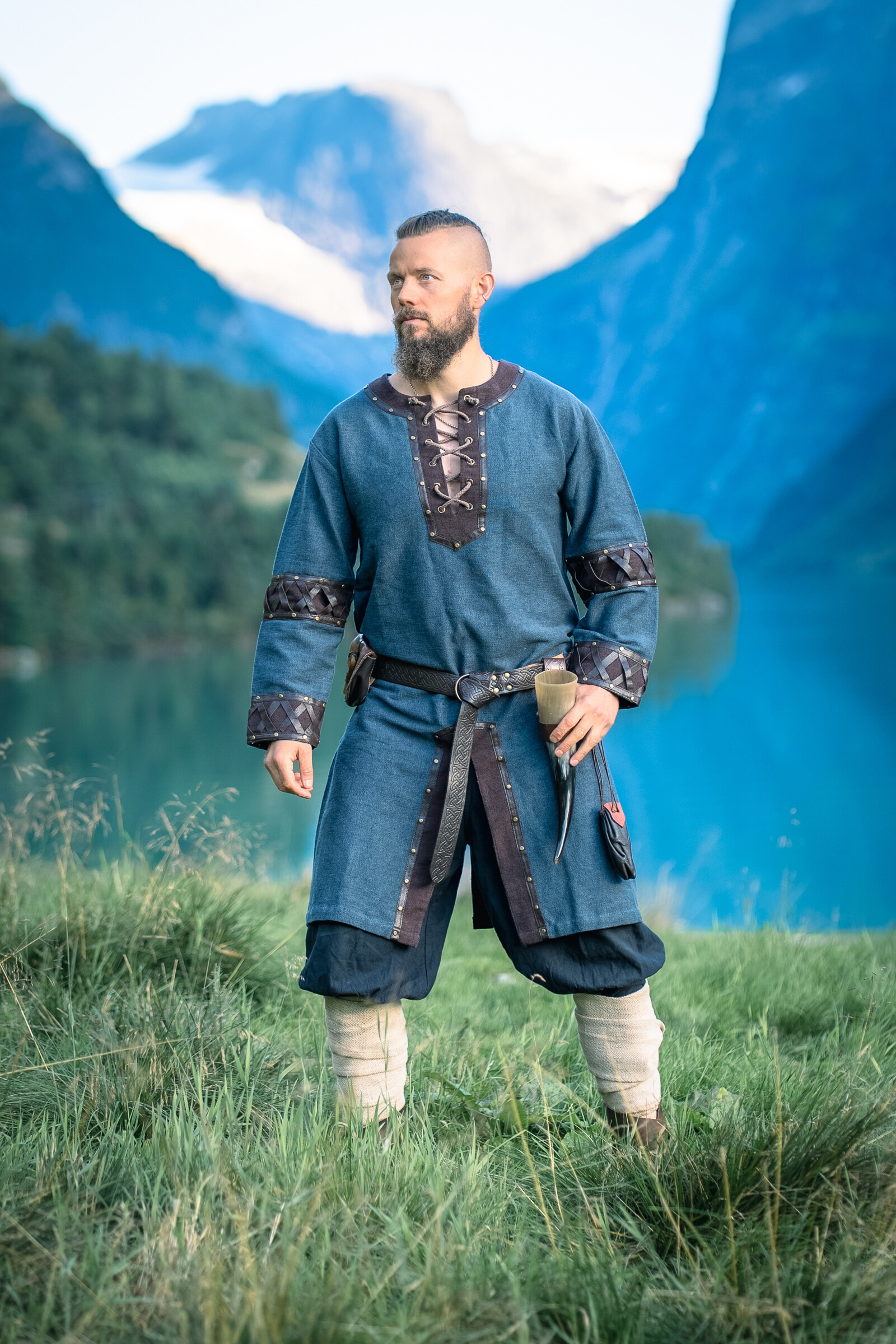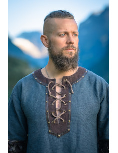 Choose the Leif Blue Viking Tunic with Genuine Leather Details and let your attire tell stories; a garment designed to accompany you on epic adventures, with style, durability, and comfort.